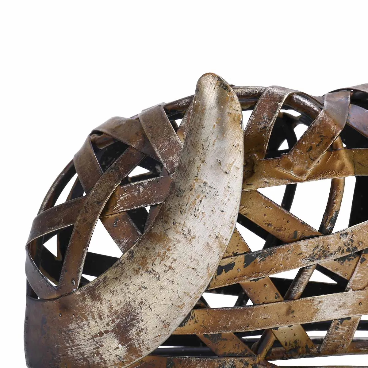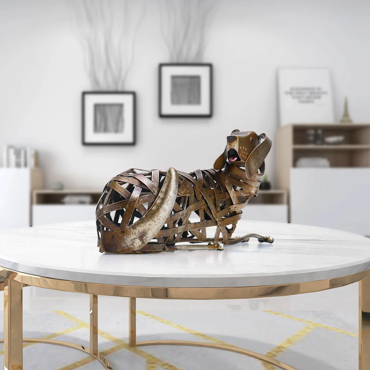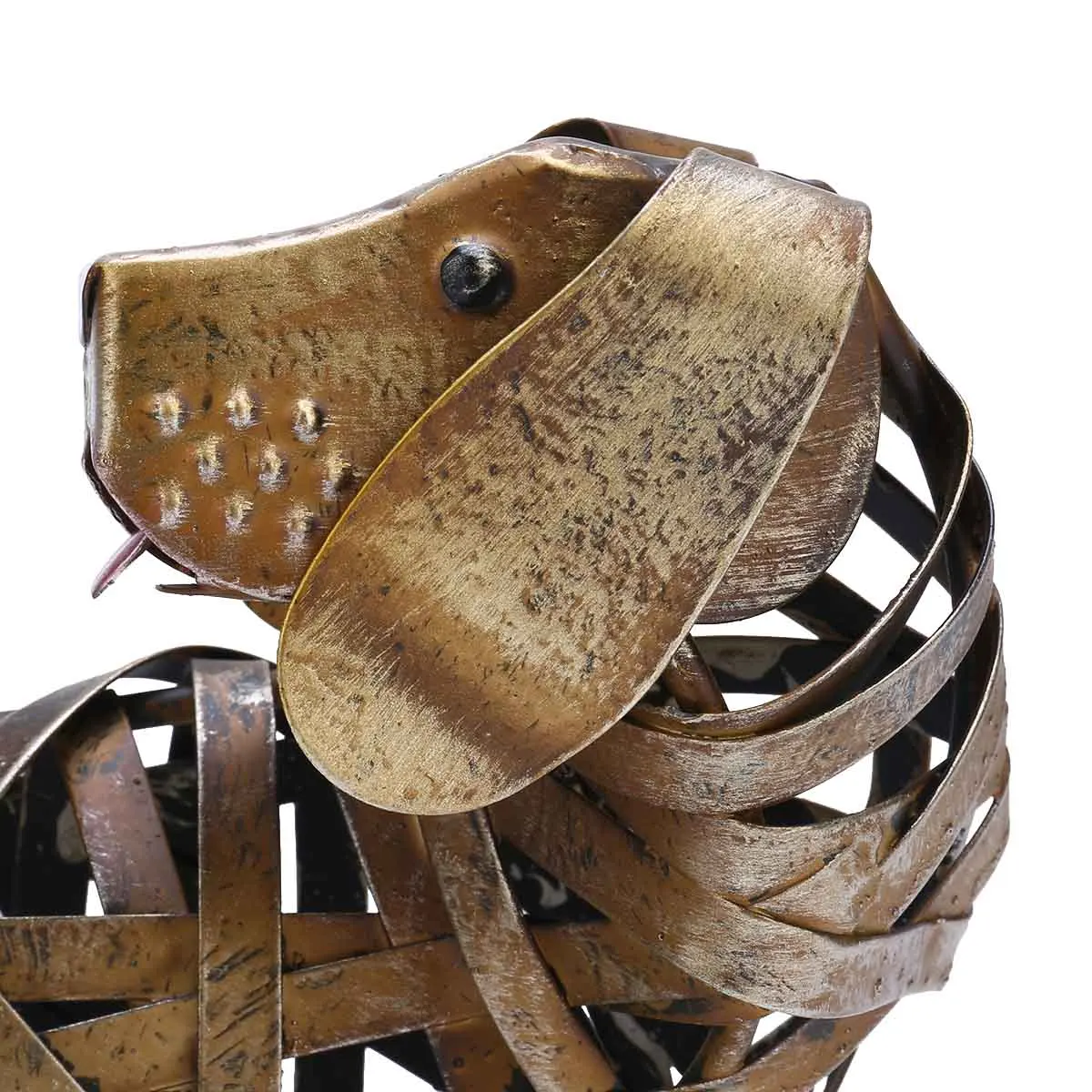 The creatively designed braided dog sculpture woven from the iron ribbon. The dog lying on the floor and turned back to see something, full of cuteness. Adopting quality iron raw materials, it is handmade by the artist through manual processes such as stamping, welded and baking. The surface is eco-friendly baking painted, stamping and polished several times, and the hand-painted color is natural and vivid. Creative weaving is stylish and elegant, the overall smooth and rustless, sturdy and durable. Exquisite crafts are aesthetically pleasing, and a cute look can be placed on a desk, display stand or shelf for fun. As a perfect gift for dog lovers, it must be loved.