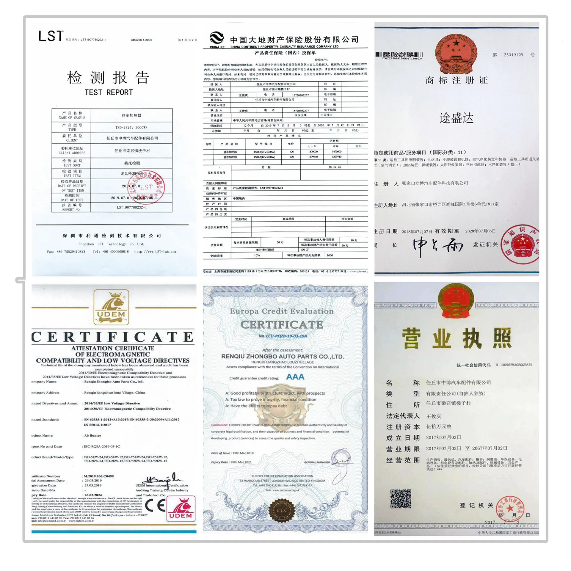 Парковочный обогреватель, произведенный компанией Renqiu Zhongbo Auto parts, получил отчет о проверке качества, сертификацию CE, сертификацию AAA, зарегистрированную собственную торговую марку, И также была страхована страховой компанией по всей стране. Видно, что качество продукции компании Zhongbo является надежным, и послепродажная гарантия, так что клиенты могут быть уверены и уверены.