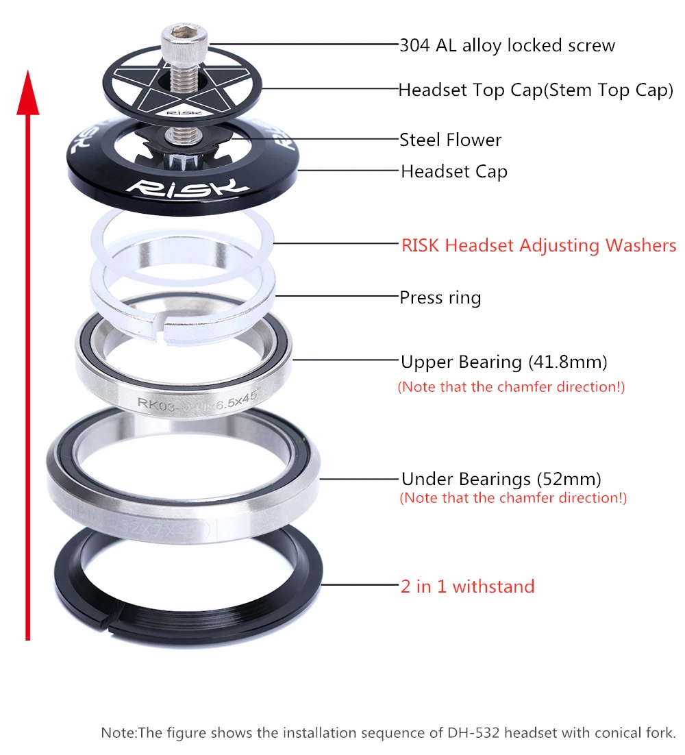 Стопорный Винт Из Сплава AL 304 Верхняя крышка гарнитуры (верхняя крышка руля) Сталь цветок Гарнитура Кепки Регулировочные шайбы для гарнитуры Пресс кольцо Верхний подшипник (41,8 мм) (Обратите внимание, что направление фаски!) Под подшипники (52 мм) (Обратите внимание, что направление фаски!) 2 в 1 выдерживать Примечание: На рисунке показана последовательность установки DH-532 гарнитуры с конической вилкой.
