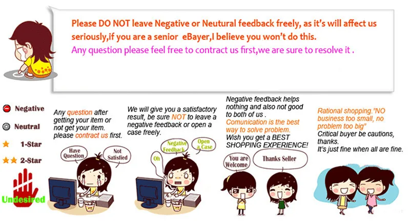 Пожалуйста, дайте нам знать, прежде чем оставить отрицательный отзывы или 1 точку, 2 точки низкого DSR или открыть любые споры на Aliexpress, пожалуйста, дайте нам возможность решить любые проблемы, и мы постараемся сделать все возможное, чтобы удовлетворить ваши потребности.
