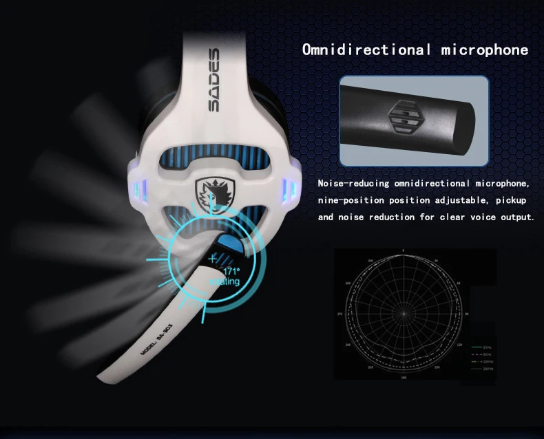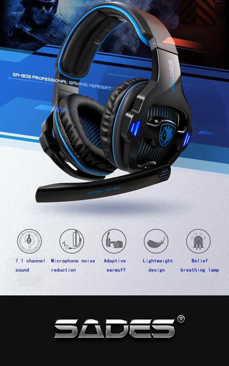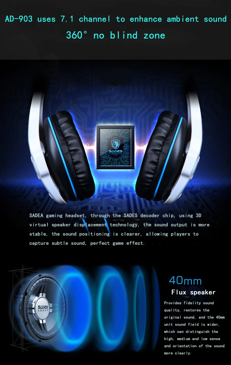 1. 7,1 звуковой канал обеспечивает захватывающий объемный звук с отдельно регулируемыми уровнями 2. Складной, всенаправленный, микрофон A. Уменьшение отвлекающего фонового шума B. Легко вращается в лучшем положении для четкого выбора голоса Способ, когда вы не говорите 3. Управление звуком и микрофоном на кабеле, простой в использовании переключатель громкости и отключения звука 4. Светодиодный светильник выглядит более крутым и модным 5. Подушка из искусственной кожи A. Мягкие чехлы для ушей обеспечивают комфорт ваших ушей B. Дышащий материал помогает уменьшить нагрев и нарастание влаги
