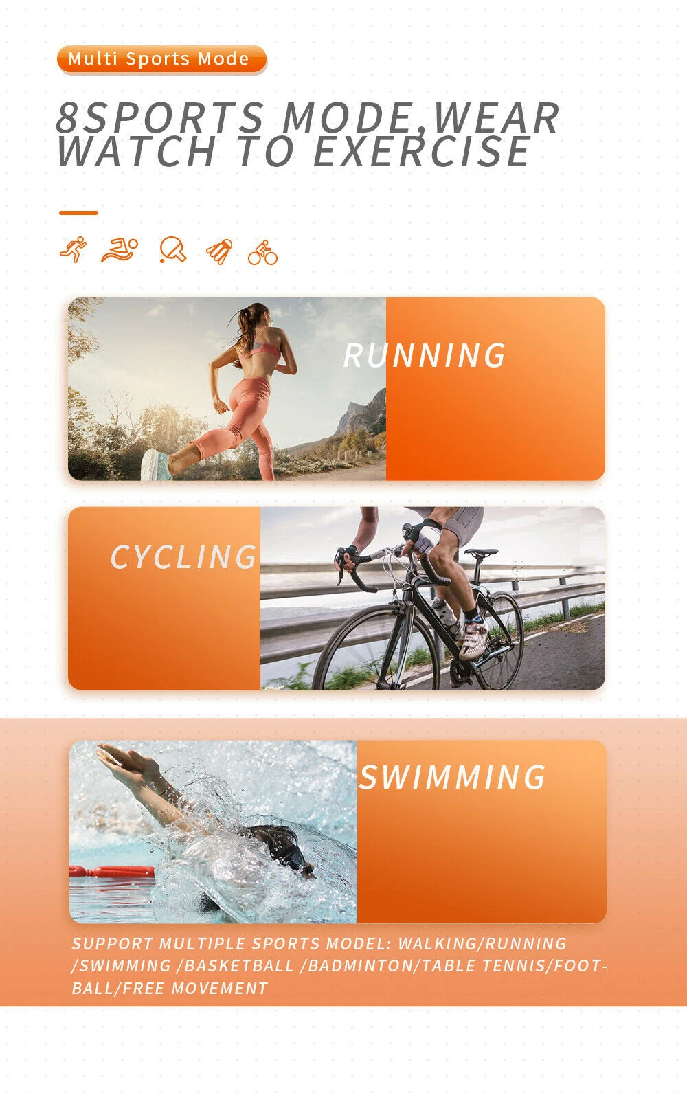 2,8 спортивных режимов: бег, плавание, Велоспорт, бадминтон, баскетбол и т. Д.