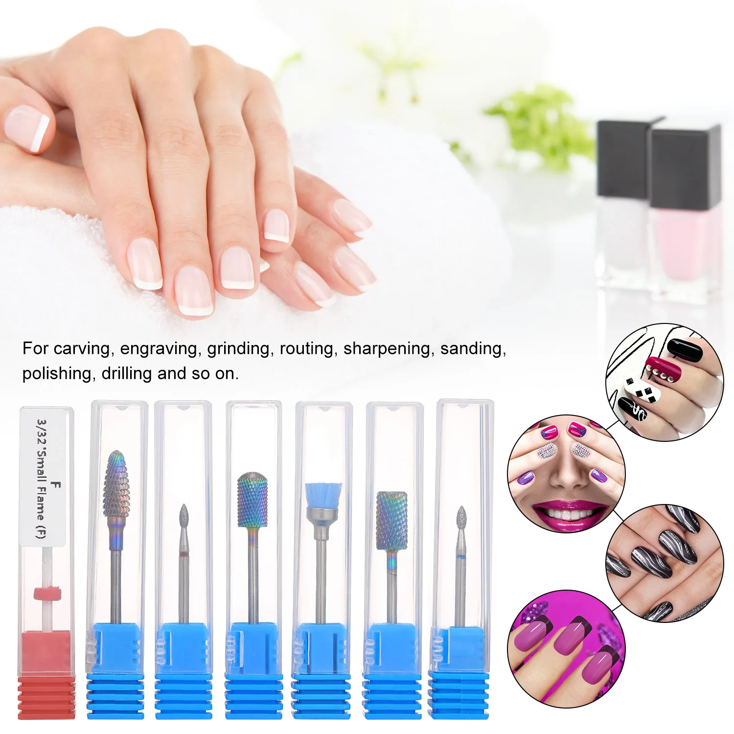 Этот набор сверл применим в маникюрной дрели, выполняя разнообразные профессиональные работы, такие как резьба, гравировка, шлифовка, маршрутизация, заточка, шлифовка, полировка, сверление и так далее.