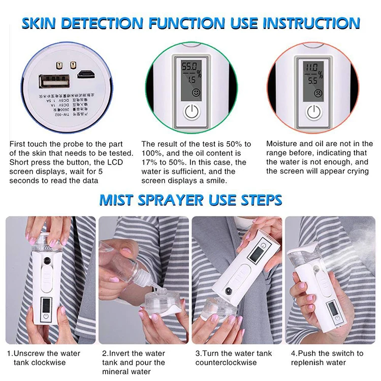 ♡Подтяжки кожи поры: Нано-распылитель расслабит голодную кожу после солнечных ожогов или после нанесения маски для лица или массажа лица, используйте нано-распылитель, который поставит кислород, чтобы кожа быстро восстанавлилась ♡Акне терапевтическое косметическое: Нано-распылитель может также использоваться для лечения акне и восстановления кожи в нормальном состоянии с помощью произведенной сверхтонкой частицы. ♡Влажности кожи тестирования: Включите переключатель, первоначальное состояние ЖК-экрана составляет 0,0, затем используйте два металлических зонда на задней части распылителя, коснитесь кожи В то же время на дисплее будет отображаться влага кожи и содержание жира, смайлик показывает хороший баланс влаги и масла, в то время как плачущее лицо показывает отсутствие влаги и необходимости восполнять Увлажнение