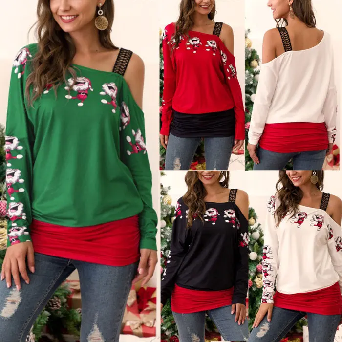 Женская рождественская блузка с принтом, длинный рукав, с открытыми плечами, Длинные Топы NFE99