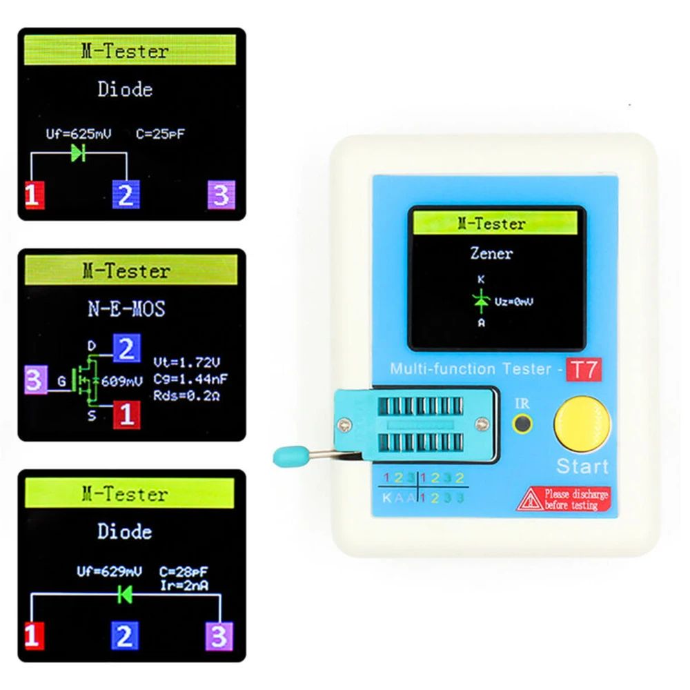 * Он может широко использоваться для обнаружения NPN и PNP транзисторов, конденсаторов, резисторов, диодов, триодов, n-каналов и p-каналов MOSFET, IGBT, JFET, triac и батареи и т. Д.