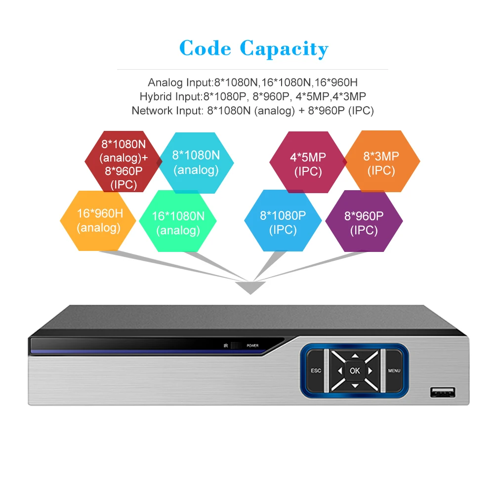 Этот гибридный видеорегистратор поддерживает аналоговые камеры и IP-камеры, поскольку поддерживает ONVIF с ограниченной совместимостью со сторонвечерние IP-камерами. Поддержка s IP, AHD, аналоговых камер, CVI, TVI.