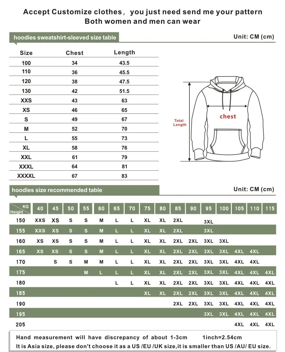 3. Наш бренд самостоятельно производится и продается по более низкой цене, и мы искренне приглашаем покупателей к долгосрочному сотрудничеству. 1. Погрешность в размере: Таблица размеров для ручного измерения плитки, пожалуйста, учитывайте погрешность 1-3 см (1 см = 0,3917 дюйма) 2. Цвет: разные компьютерные экраны могут отображать разные цвета, даже если они одного цвета. Пожалуйста, имейте разумный цветРазница. Спасибо за понимание. Название продукта: Harajuku магазин одежды для настройки 3D толстовки Стиль: Модный и повседневный Пол: Для МужчинЖенщины Применение: повседневный, повседневный Материал: полиэстер Тип узора: отпечатанный Стиль: Повседневный, Спортивный Длина рукава: длинный рукав Размер: Соответствует размеру Толщина: Стандартная Как стирать: Ручная стирка в холодной воде, подвешивание или сушка Что вы получаете: 1 Блузка Примечание:Изготовленный на заказ Печать поддерживается