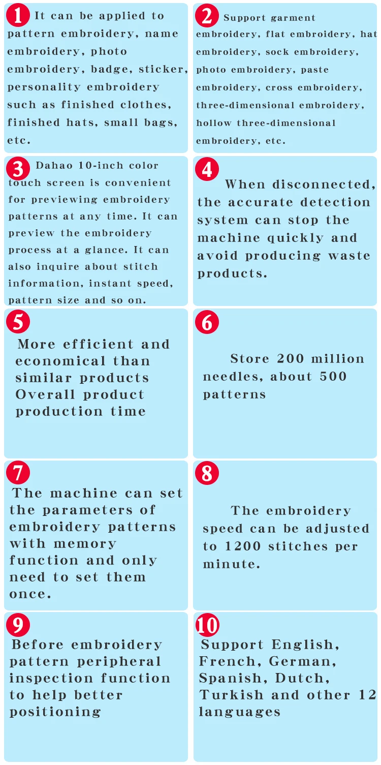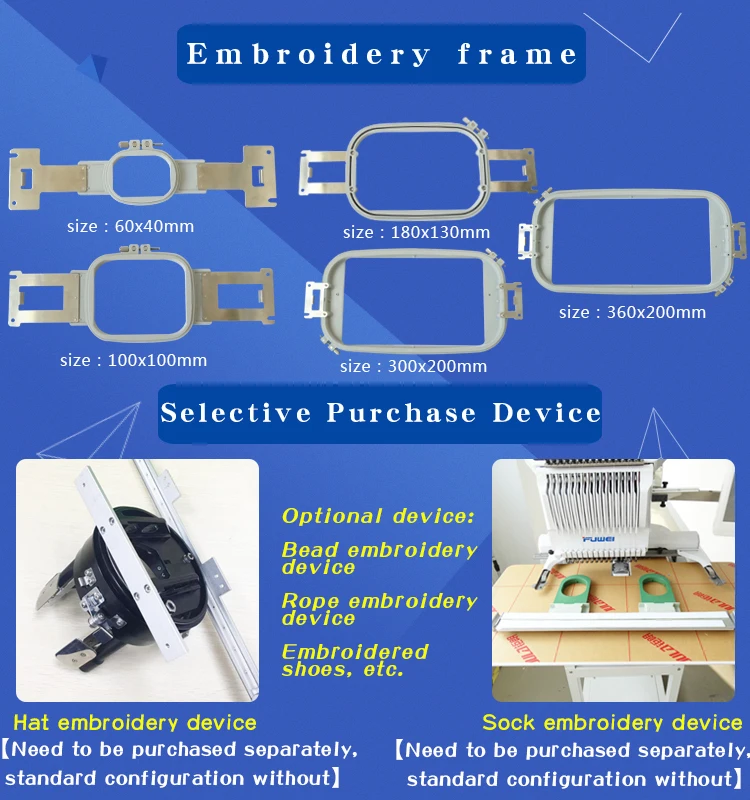 Примечание: машина оснащена вышитой рамкой и простой вышитой рамкой, за исключением вышивания колпачков и вышивания носков (если вам нужны эти два устройства, вы должны купить их отдельно). Для клиентов, которым нужна Кепка с вышивкой и носок, пожалуйста, обратитесь в службу поддержки клиентов!