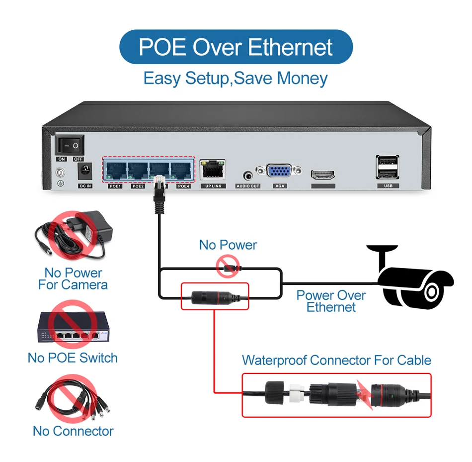 Не нужны дополнительные кабели питания или адаптеры или переключатели. Подключи и работай и простая настройка. Экономьте деньги и удобно, POE NVR = NVR + POE коммутатор