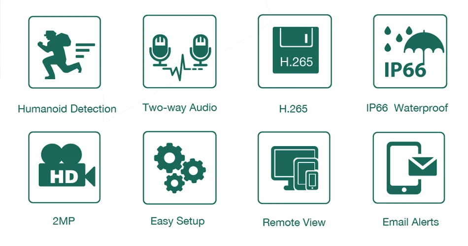 Обнаружение человека: только Обнаружено движение человека, уменьшает Ложные сообщения тревоги. Двухстороннее аудио: Встроенный водонепроницаемый динамик и микрофон, может быть Интерком. Настраиваемая Голосовая Сигнализация: разумно Настройте область сигнализации, которую вы хотите, голосовое оповещение. Металлический корпус, защищенные от атмосферных воздействий камеры безопасности, широко используются для внутреннего/наружного использования