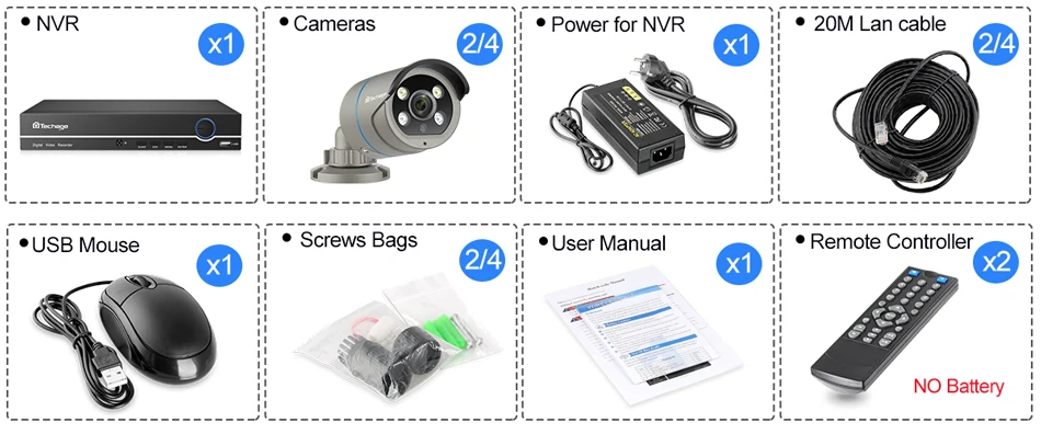 1 x 8CH 1080P H.265 POE NVR 2/4 x 2MP 1080P водонепроницаемый открытый ip-камеры с питанием по POE 2/4x20 м сетевой кабель для камеры 1 x Блок питания для NVR 1 х Мышь для NVR Руководство пользователя на английском языке-1 шт. 2 x Предупреждение Стикеры (подарок) 2/4 x винты и водонепроницаемый разъем для камер (подарок) 1 X пульт дистанционного управления (без аккумулятора) НЕТ HDD или включен HDD для опционального Жесткий диск необходим для записи видео, если вы выбрали этот комплект с жестким диском, он будет предварительно установлен в nvr для отправки! Когда жесткий диск заполнен, вы можете установить его для перезаписи старого видео или остановки записи.
