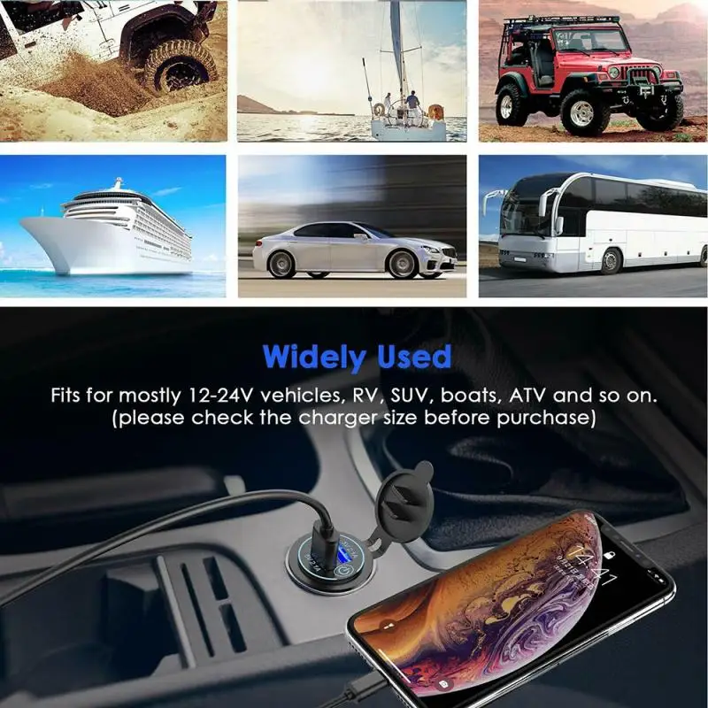 Водонепроницаемый дизайн: он оснащен Резиновой Крышкой USB, которая обеспечивает водонепроницаемость IP66, водонепроницаемость от воды и пыли, лучшую защиту внутренней схемы и более эффективный срок службы. Отличные аксессуары для почти всех автомобилей 12 В 24 В, морских автомобилей, квадроциклов, мотоциклов, велосипедов, грузовиков, автомобилей для гольфа, RVs, лодок, внедорожников и т. д.