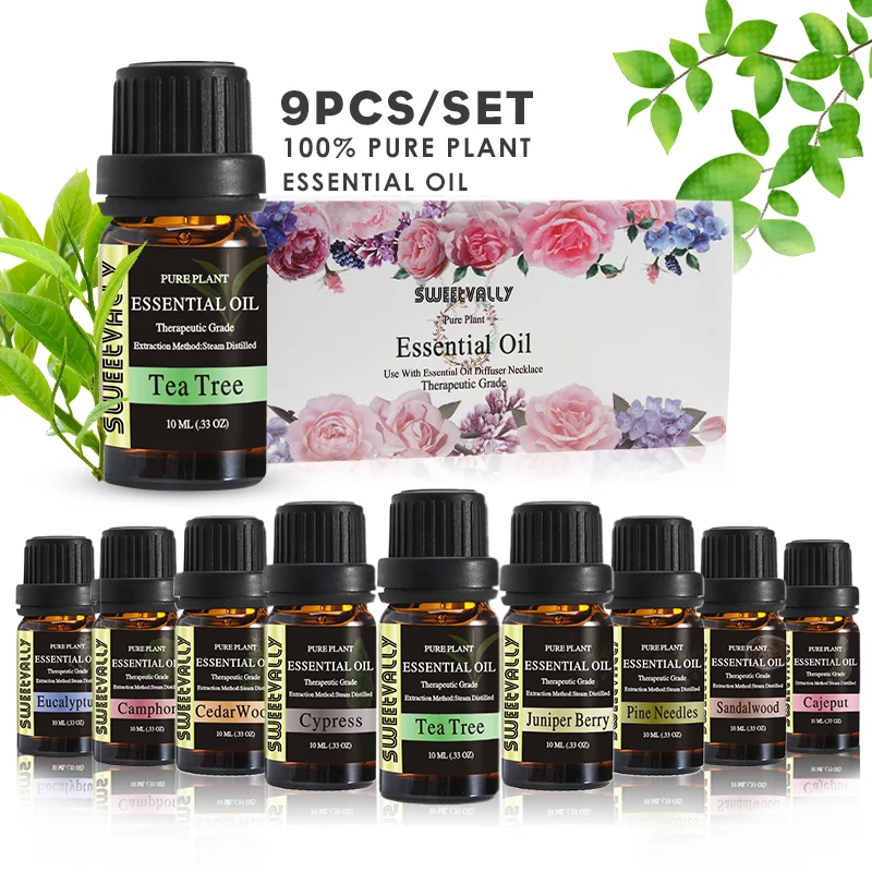 9 шт. эфирное масло: сосновая игла + кедровая древесина + cajeput + Juniperberry + сандаловое дерево + кипарис + чайное дерево + эвкалипт + камфора