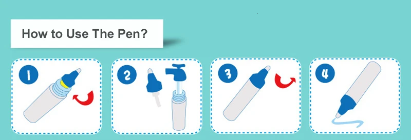1. Перед использованием, пожалуйста, положите головку ручки для рисования в воду, чтобы замочить на 2-3 часа. Убедитесь, что ручка работает плавно.