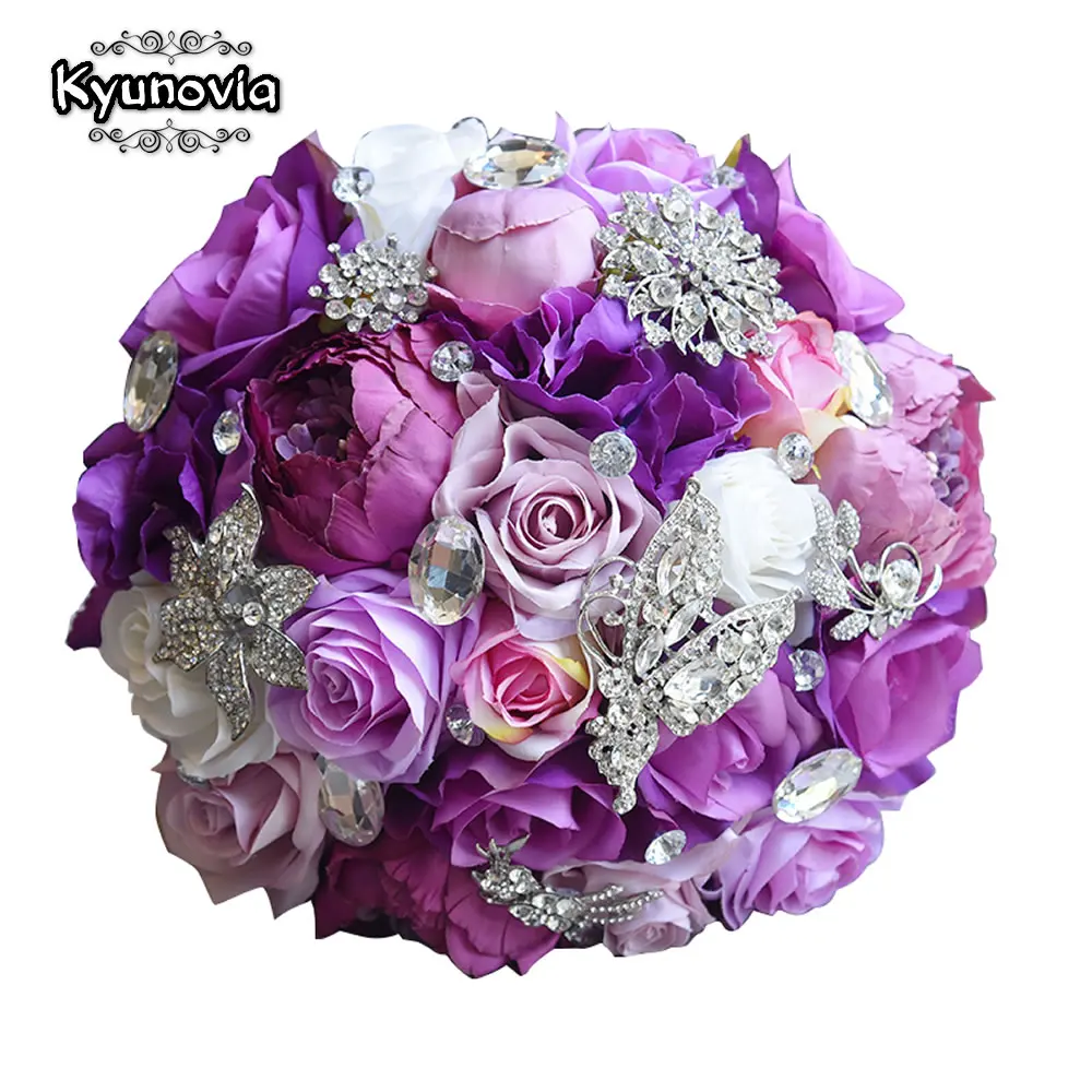 Kyunovia Шелковый Свадебный букет из искусственных роз, букет подружки невесты, букеты из роз, комплект из 3 предметов, фиолетовый акцент, свадебный букет с брошью FE83