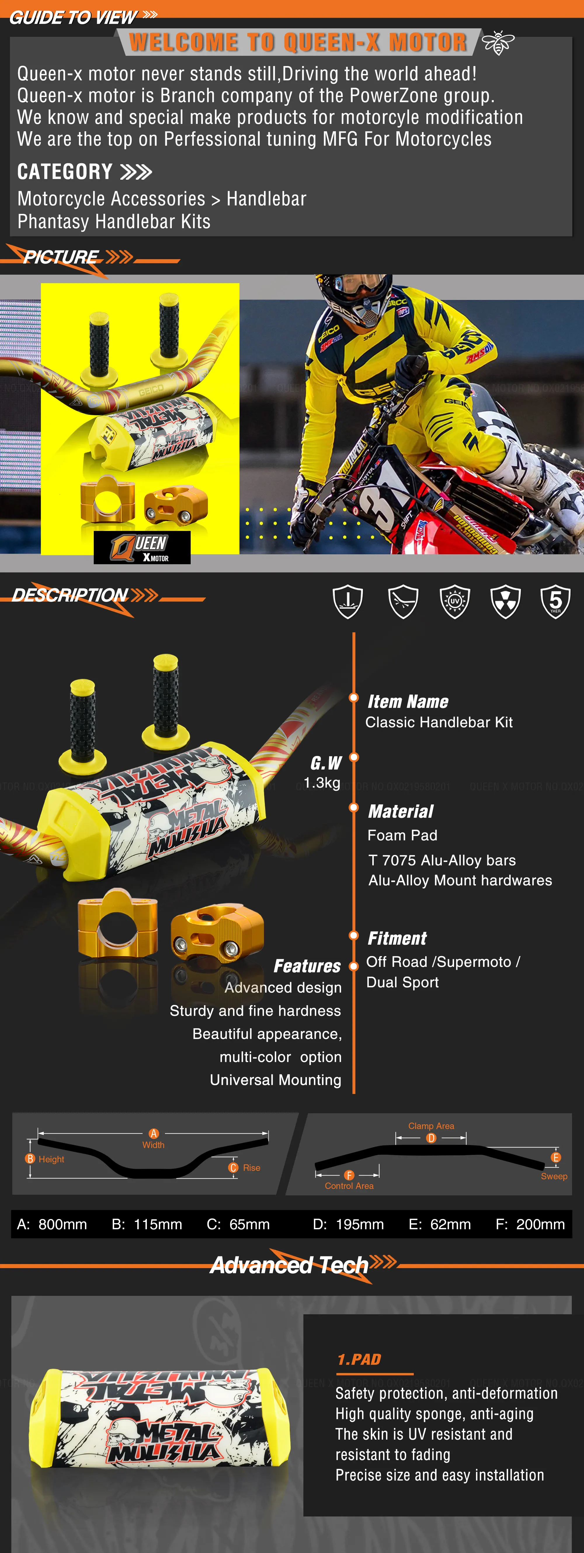 Диаметр центральной трубки: 28 мм Общая длина: 800 мм 7075 алюминий с термообработкой T4 и T6 Дробленая и анодированная отделка для повышения прочности на усталость и устойчивости к коррозии С накладкой и захватами С-крепление на руль Применимость: Подходит для большинства грязи питбайк, мотоцикл крест