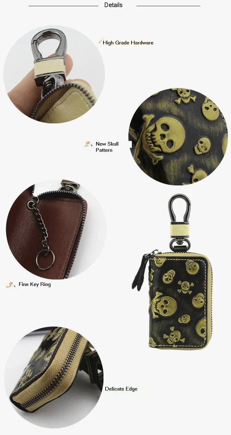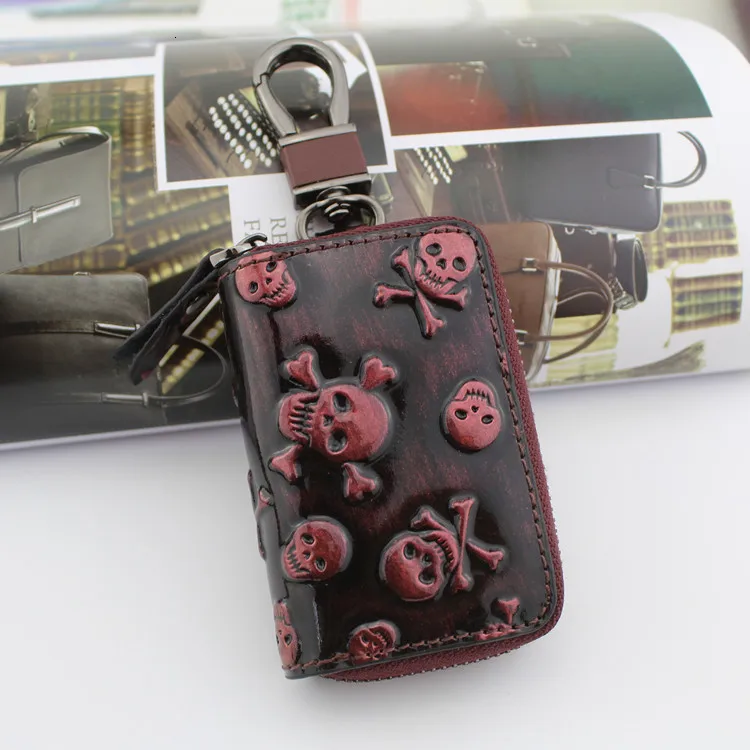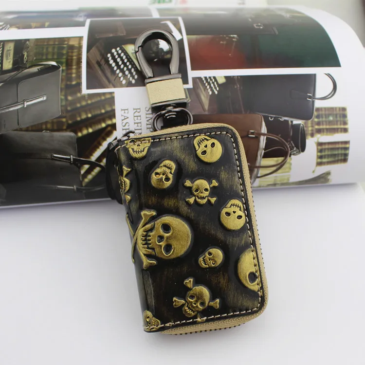 Кошелек для ключей от автомобиля из натуральной кожи, мужская и женская сумка из воловьей кожи с черепом, ключница на молнии, индивидуальный Ретро чехол для ключей для дома