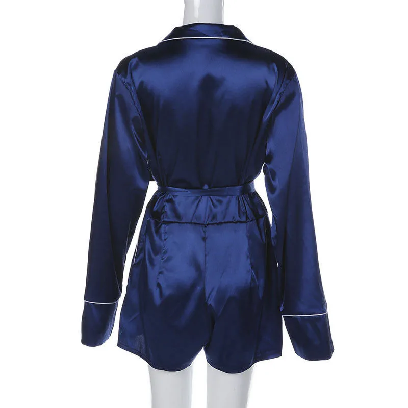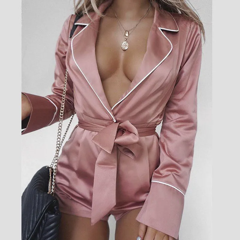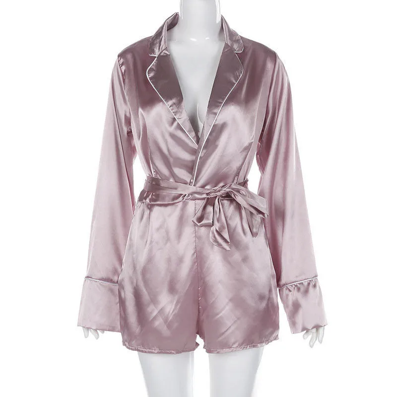 Женская сексуальная пижама с v-образным вырезом, комбинезон для женщин, однотонная шелковая атласная одежда для сна, ночная одежда с длинным рукавом, вечерние, пляжные комбинезоны с поясом, хит продаж!