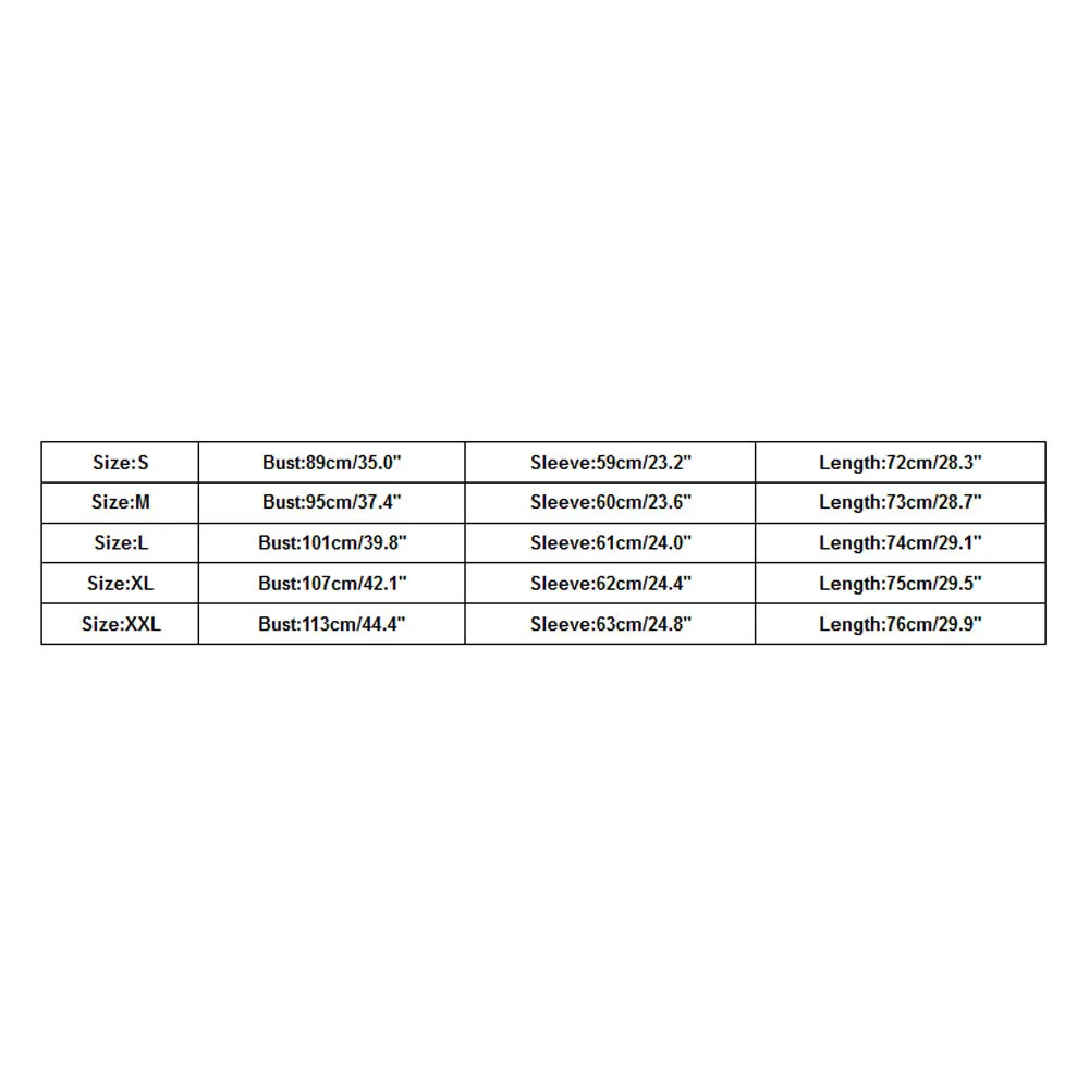 РазмерОбхват грудиРукаваДлинаS89 см/35,0"59 см/23,2''72 см/28,3''М95 см/37,4''60 см/23,6''73 см/28,7"L101 см/39,8"61 см/24,0''74 см/29,1''XL107 см/42,1"62 см/24,4''75 см/29,5"XXL113 см/44,4"63 см/24,8''76 см/29,9"