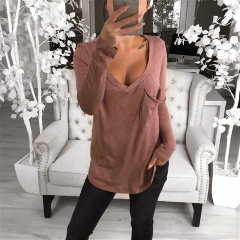 Осень, с капюшоном, длинным рукавом и Для женщин футболка Повседневное V образным вырезом однотонная уличная одежда свободного кроя Базовая футболка Женская мода топ размера плюс