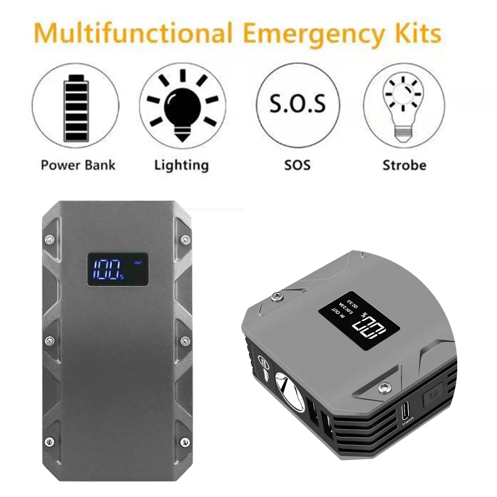 Стартер для автомобиля (внешний аккумулятор) * 1 Защитные зажимы (красный = Положительный; Черный = отрицательный) * 1 Кабель зарядного устройства от 1 до 3*1 Инструкции на английском языке * 1 Адаптер прикуривателя в подарок * 1 Ящик для инструментов * 1