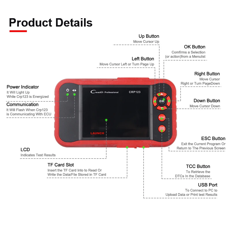 CRP123 имеет уникальный и 3,5 дюймовый TFT цветной дисплей, CRP 123 OBDII/EOBD считыватель кодов поддерживает все 10 режимов тестирования OBDII для полной диагностики. Она является поистине конечной в силе. И доступностью, что позволяет пользователям делать свою работу быстрее. Таблица, запись, воспроизведение данных и кодовые подсказки для поиска и устранения неполадок помогают пользователям экономить время на диагностику и ремонт. CRP123, самый продвинутый и многофункциональный считыватель кода, приведенный в действие своей эксклюзивной технологией, предназначен для техников для устранения проблем четырех систем для большинства основных транспортных средств на дороге сегодня, но поставляются с добавленными преимуществами чтения данных для 4 систем и диагностического отчета транспортного средства. Для диагностики системы двигателя: диагностический инструмент может помочь определить воспламенение двигателя, впрыск топлива, соотношение воздуха и топлива, а также условия выхлопа в системе двигателя для повышения производительности транспортного средства, экономии энергии и уменьшения выхлопа. Для диагностики передачи: это имеет большое значение в безопасном вождении, когда ваш автомобиль соскальзывает или трудно изменить. Этот диагностический сканер может определить проблемы с помощью чтения кодов в системе передачи, или проверить состояние здоровья с помощью просмотра данных в реальном времени. Для диагностики системы ABS: Диагностика проблемы ABS всегда должна начинаться с визуального осмотра всех компонентов тормоза, затем вам нужно будет получить коды ABS, чтобы сказать вам, где проблема, И это то, что этот сканер делает для вас. Для диагностики системы SRS: SRS, система безопасности, состоит из датчиков удара, модуля управления, и сами подушки безопасности, И это диагностическое устройство может обнаруживать Каждый электронный параметр, чтобы проверить его состояние здоровья.