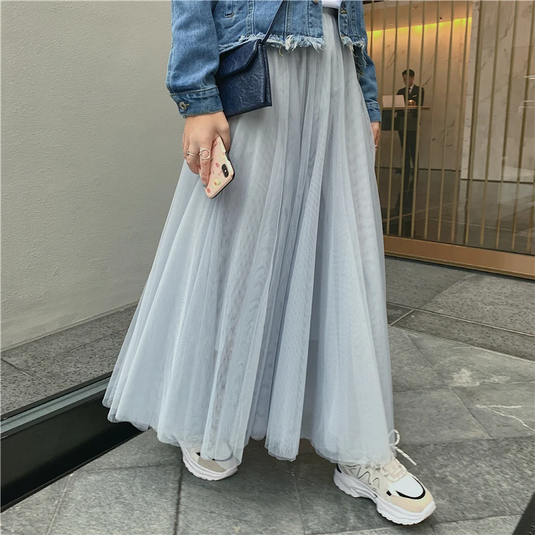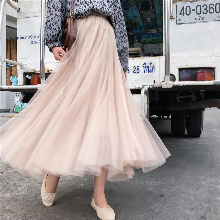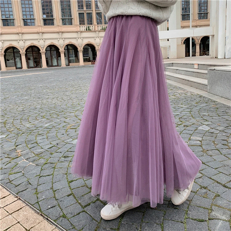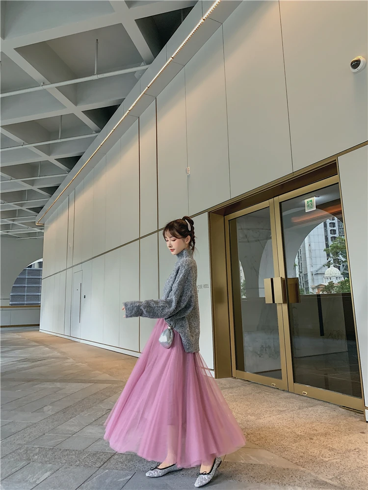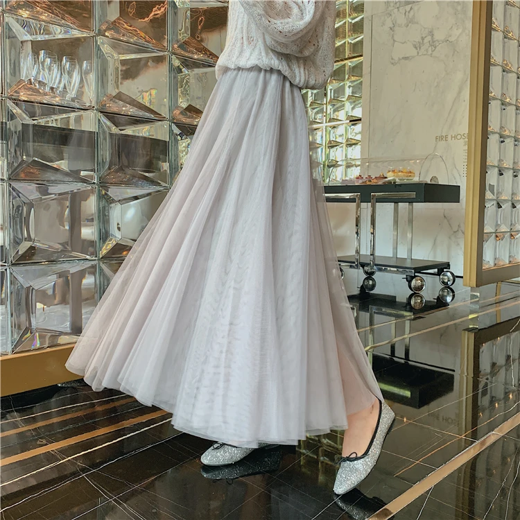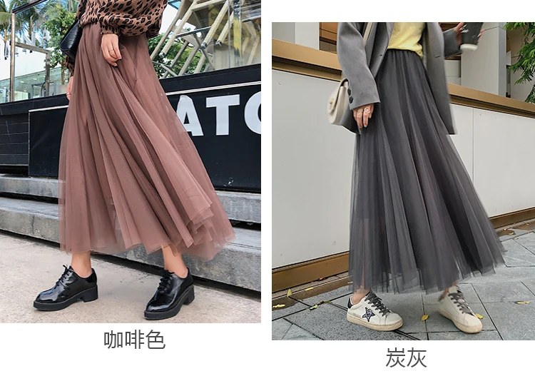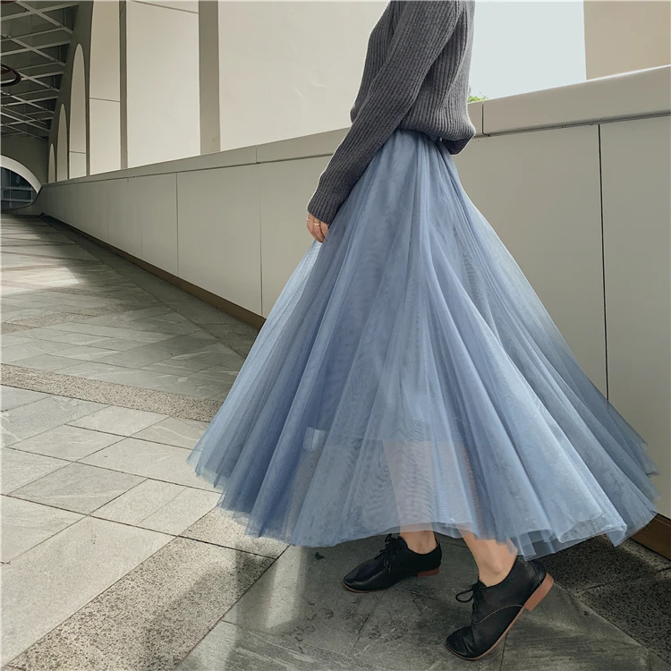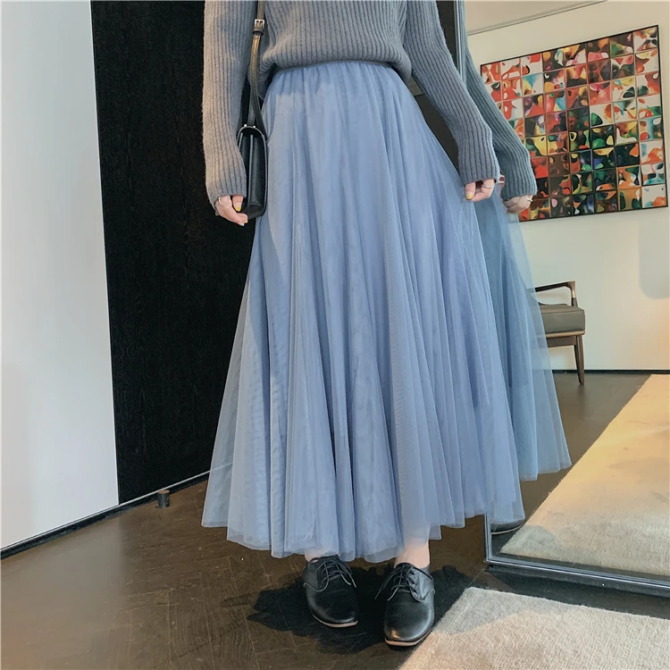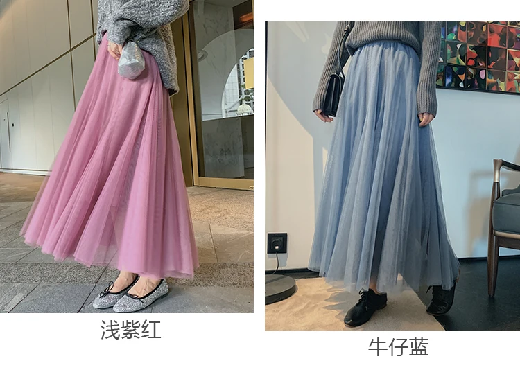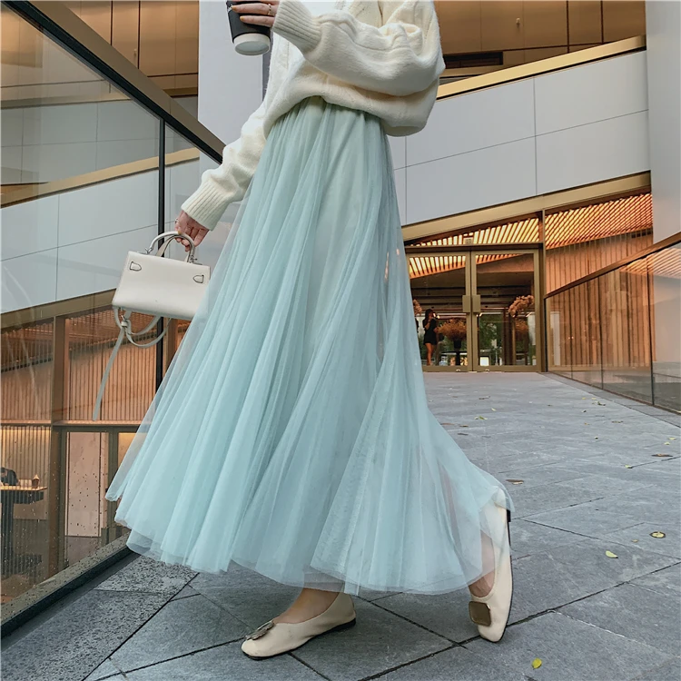 Элегантная фатиновая юбка TingYiLi, Женская широкая юбка, Корейская милая розовая зеленая серая синяя коричневая черная длинная юбка-пачка на осень и зиму