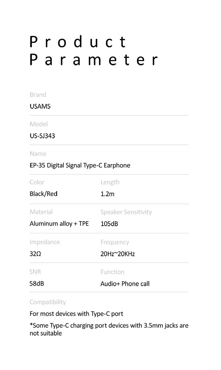 Технические характеристики: Тип: USAMS EP-35 Название: наушники-вкладыши типа c Материал: АБС + металл Метод ношения: наушники-вкладыши Длина: около 1,2 м Динамик: диаметр 14 мм Динамик Чувствительность: 102dB Чувствительность микрофона:-48/-3dm Частотный диапазон: 20 Гц ~ 20 кГц \ Сопротивление: 32 Ом Тип порта: устройства типа C Особенности: 1. Отличное качество звука, обновляет наушники, показывает 4D стерео. 2. Биомиметическая технология, хорошая и удобная в использовании 3. Музыка в сочетании с металлом, высокий светильник процесса окисления, уникальный внешний вид. 4. Материал из алюминиевого сплава, дизайн в уши, высококачественный микрофон, четкий вызов и музыка 5. Обновленный мягкий и экологичный провод из ТПЭ, прочный в использовании 6. Совместим с Xiaomi 8SE/Xiaomi MIX2/Xiaomi 6/Xiaomi note 3/huawei P20/huawei mate 10 pro/Smartisan 3/Smartisan Pro 2/Smartisan R1 и т. Д. PS: если ваш мобильный телефон не включен в вышеуказанные модели телефонов, пожалуйста, свяжитесь с нами, чтобы убедиться, что вы можете использовать эти наушники. Послепродажное обслуживание: Мы обещаем, что все продукты являются 100% оригинальными USAMS брендом. 100% Полная проверка, все продукты имеют гарантию качества! И мы предоставляем послепродажное обслуживание 1. Этот продукт имеет 3 месяца гарантии. Любые проблемы с качеством, вы можете связаться с нами, мы можем отправить его для вас свободно. 2. Не беспокойтесь, что не получите его. Если вы не получили посылку в течение срока защиты, мы полностью вернем или повторно, пожалуйста, свяжитесь с нами свободно! 3. Мы обещаем, что если вы получили неправильный продукт или неправильный размер, вызванный нашей причиной, мы можем отправить его свободно.