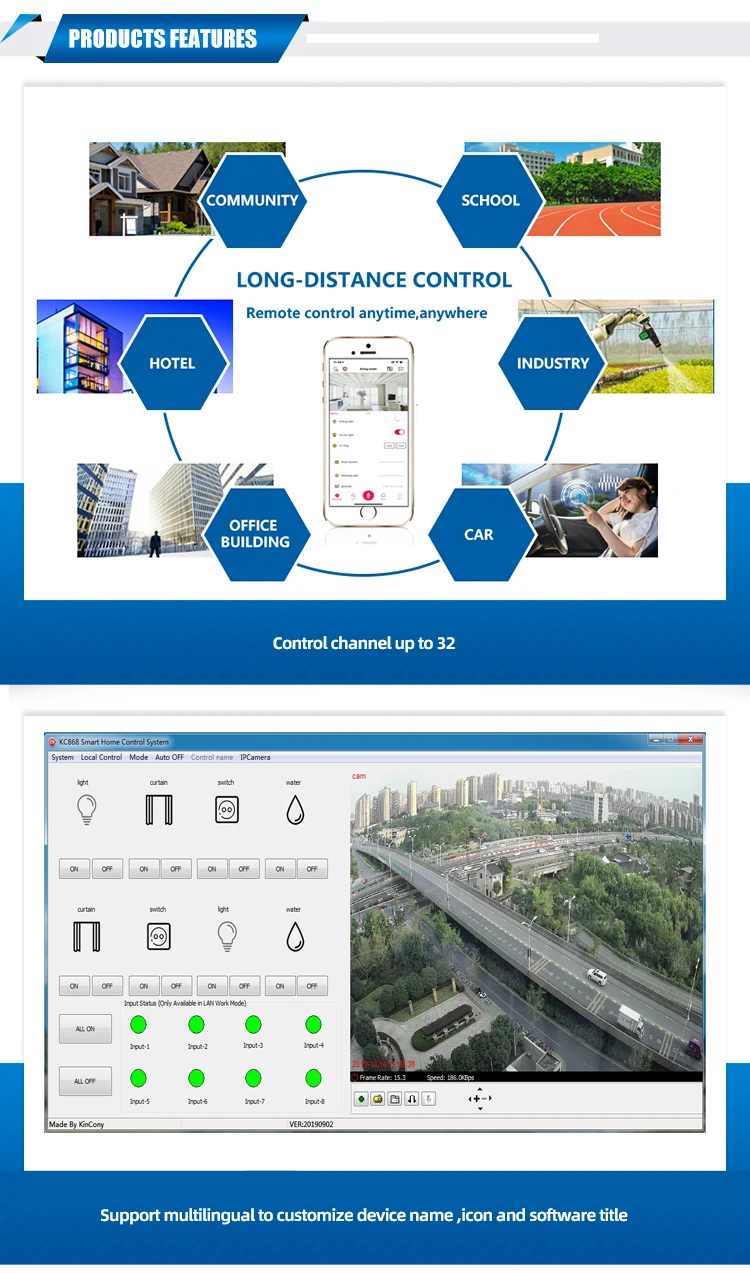 A. Перед продажей Услуги Q1. Сколько приложений может управлять устройством KC868-H32? Ответ: 32 способа применения Q2. Сколько входов имеются ли в устройстве KC868-H32? Ответ: 6-путь входного сигнала Q3. Сколько входов имеются ли в устройстве KC868-H32? Ответ: Вы можете добавить 2 шт kc868-h32 в приложении. Затем вы можете управлять 64 реле. Также, если вы добавили 3 шт. kc868-h32, вы можете контролировать 96 реле. И так далее. Все контроллеры будут добавлены в одну учетную запись приложения, не нужно менять учетную запись приложения для входа в систему и управления устройством. В4. Какова максимальная нагрузка на канал для kc868-h32 устройства? Ответ: 250 В/5A каждый канал В5.что делать, если мощность нагрузки больше номинальной мощности? Ответ: если он перегружен, внешнее высокомощное реле переменного тока может быть подключено к складу общей мощности нагрузки В6. Какой тип оборудования может быть подключен к входу блока управления kc868-h32? Ответ: оборудование имеет значение для переключения сигнала В7. Какой размер kc868-h32 блока управления? Каковы фиксированные методы установки? Ответ: 272x117x40 мм; Для фиксации путем подвешивания на рельсе непосредственно или для фиксации винтом Q8.какие интерфейсы поддерживает блок управления kc868-h32? Ответ: поддержка интерфейса RS232 и Ethernet Q9. Есть ли версия Wi-Fi? Ответ: Да. Это KC868-H32W. Q10. Каковы методы управления сетью для KC868-H32 коробок управления? Ответ: мобильный телефон с пультом дистанционного управления, ПК локальный или пульт дистанционного управления Локальный контроль: Программное обеспечение ПК; Контроль самостоятельно (Используйте протокол связи управления ler) Пульт дистанционного управления: Программное обеспечение ПК; Мобильное приложение; Управление самостоятельно (режим A: http www веб-командный режим B: кодирование самостоятельно в соответствии с вашим Учетная запись приложения для входа в систему) В11.какие типы программного обеспечения и руководства пользователя могут быть предоставлены? Ответ: инструмент сетевой конфигурации, демонстрационное программное обеспечение, инструкции и дополнительный протокол разработки и т. д. для получения более подробной информации, пожалуйста Посетите www.kincony.com/document для загрузки Q12. В тех случаях, когда нет подключения к Интернету, как дистанционный пульт устройства KC868-H32? Ответ: В локальной сети, с помощью ПК для достижения локального дистанционного управления; Или с помощью беспроводного Интернет-маршрутизатора для обеспечения проводной Для управления сигналами сети или Wi-Fi. Q13. В тех случаях, когда мобильный телефон приложение программное обеспечение может быть легко загрузить из? Ответ: для IOS, войдите в Apple app store, выполните поиск 【Kincony smart home】 для загрузки; Для Android, войдите в Google app store, Searches【Kincony smart home】 для загрузки или посещения официального сайта для сканирования QR для загрузки B. Развития самостоятельно Q1. Поддерживает ли он пользователей, чтобы писать свои собственные программы для управления устройством? Ответ: Да, поддержка. И сопутствующий пример программы является avialble. Q2. Поддерживает ли он управление устройством через браузер? Ответ: Да, поддержка. И может быть предоставлен один соответствующий чехол. Q3. Каковы способы дистанционный пульт устройства в тех случаях, когда пользователи программы сами? Ответ: программное обеспечение для ПК, браузер для управления. Q4. Это при условии,