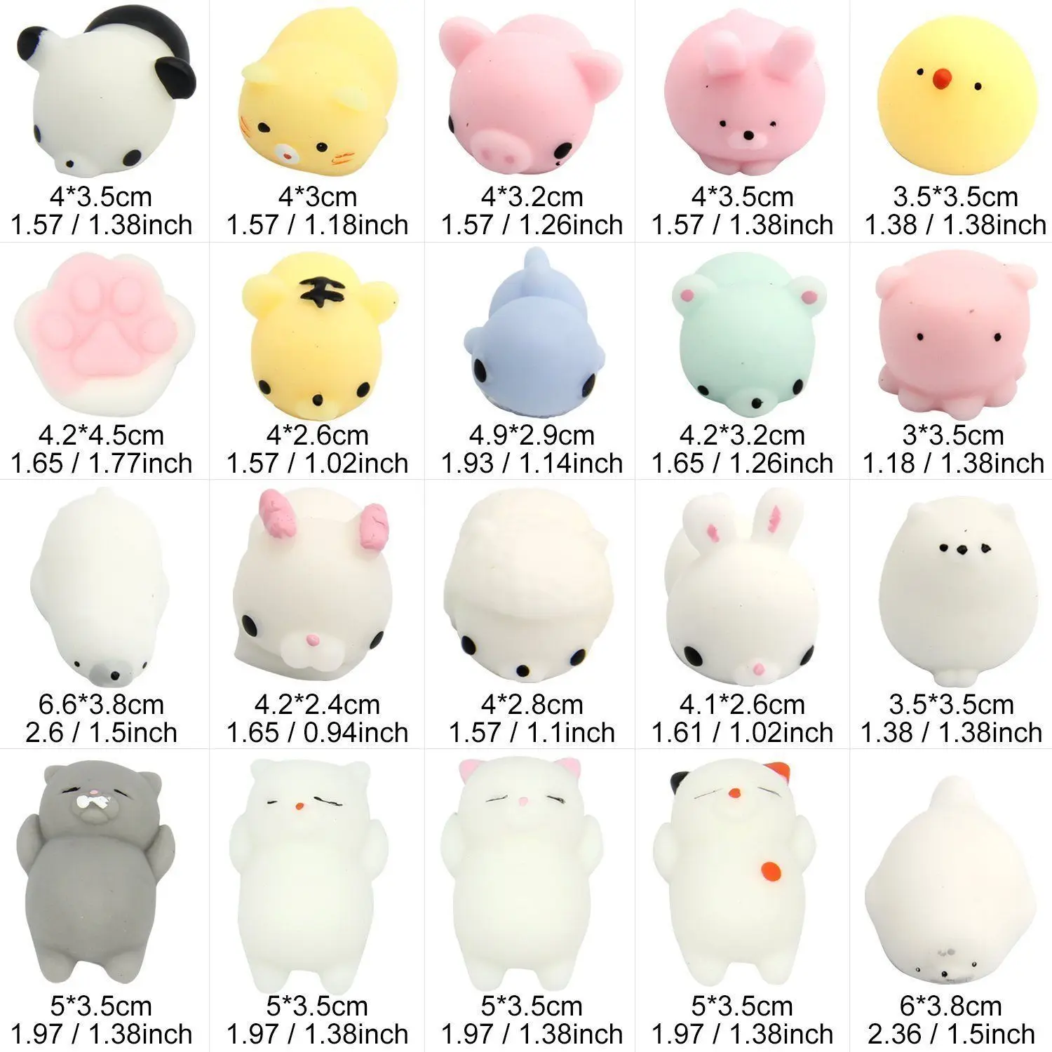 Особенности: -Более 20 вариаций -Каждый из них красивее, чем последний! -Уникальные и веселые, они гарантированно заставят вас улыбаться. -Они самые мягкие игрушки -Снятие стресса или просто забавное украшение для вашей спальни, автомобиля, окна или стола. Характеристики: Количество: 1 шт. TPRScented: нет Упаковка: индивидуально обернутый пластиковый мешочек Посылка включает в себя:1 х случайные мягкие игрушки Mochi Обратите внимание: -Он не съедобный. -Не подходит для детей в возрасте до 3 лет -При чрезмерном сдавливании краска на сжимаемой поверхности может упасть. -Держите подальше от тепла