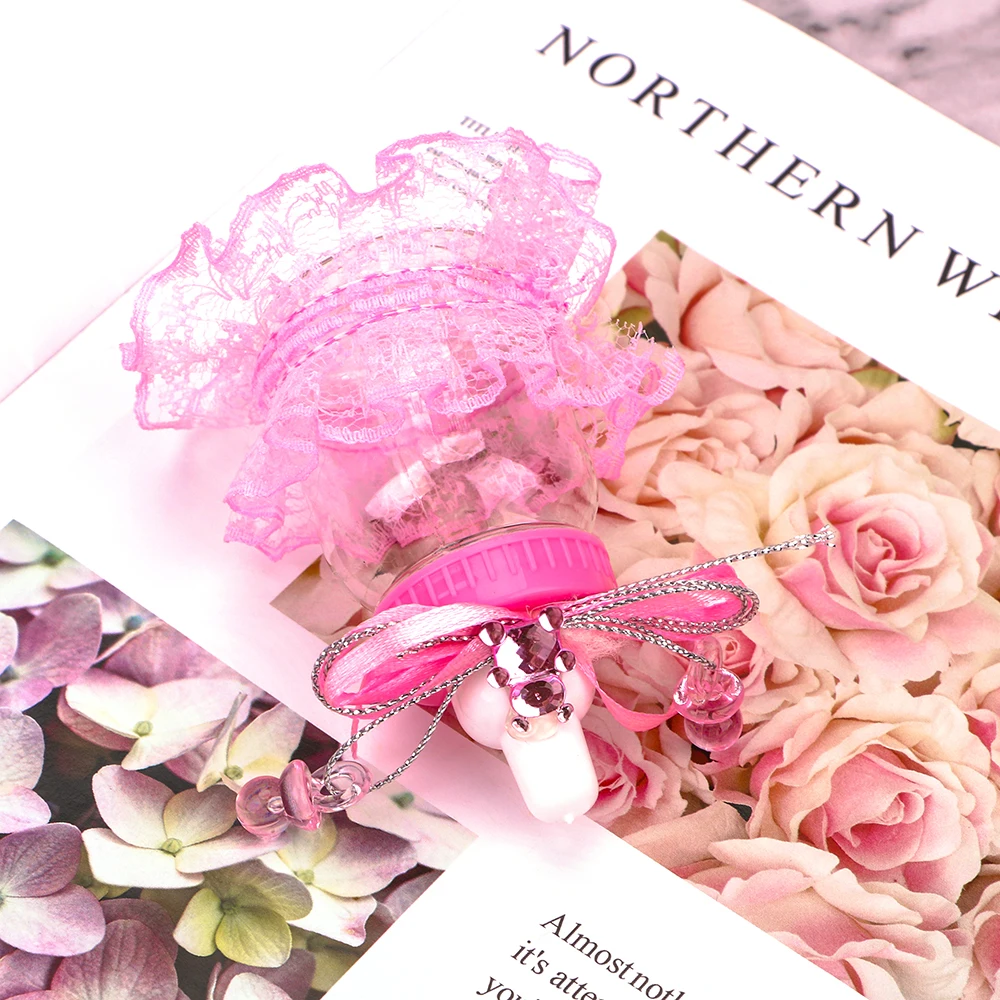 Дизайн бутылочки для кормления, с красивым бантом, хрустальным медведем и декоративными лентами, выглядит действительно мило, мило и деликатно.