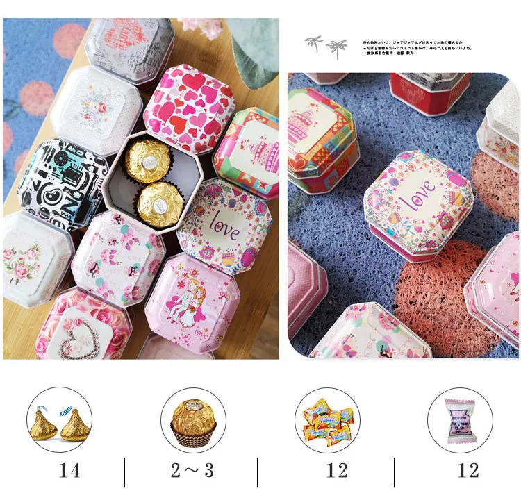 Размер: 6X6X4 см Материал: железо Вес: 35 г/шт. Упаковка: Мини-жестяная коробка X 1 шт. Вместимость: около 2 Ферреро, или 14 шоколадных конфет Hershey, или 12 альпийских конфет, или около 15 граммов цветочного чая, или около 50 граммов чая. Вышеуказанные данные приведены только для справки.
