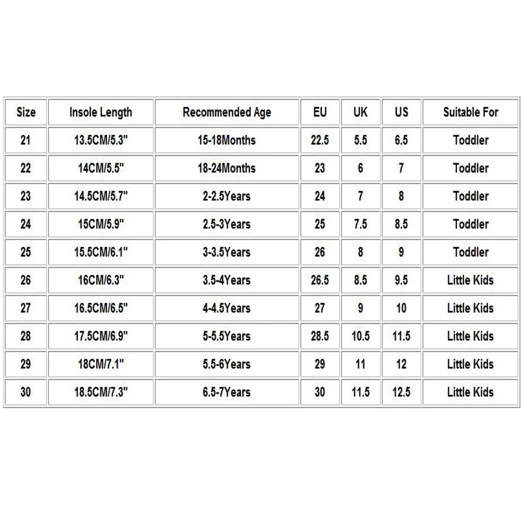 Размеры Стельки Длина Рекомендуемый возраст ЕС Великобритания Свяжитесь с нами Подходит для 21 13,5 см/5,3" 15-18Months 22,5 5,5 6,5 Для детей ясельного возраста 22 14 см/5,5" 18-24Months 23 6 7 Для детей ясельного возраста 23 14,5 см/5,7" 2-2.5Years 24 7 8 Для детей ясельного возраста 24 15 см/5,9" 2,5, для возраста до 3 лет 25 7,5 8,5 Для детей ясельного возраста 25 15,5 см/6,1" 3-3.5Years 26 8 9 Для детей ясельного возраста 26 16 см/6,3" 3,5-4 лет 26,5 8,5 9,5 Дети дошкольного возраста 27 16,5 см/6,5" 4-4.5Years 27 9 10 Дети дошкольного возраста 28 17,5 см/6,9" 5-5.5Years 28,5 10,5 11,5 Дети дошкольного возраста 29 18 см/7,1" 5,5-6 лет 29 11 12 Дети дошкольного возраста 30 18,5 см/7,3" 6,5-7 лет 30 11,5 12,5 Дети дошкольного возраста
