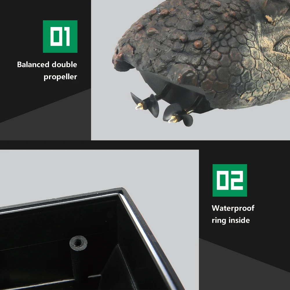 The 2-channel operation of moving forward and backward, turn left and right, simulating the speed and movement of the real crocodile, freely flows in the water. The simulated crocodile RC boat helps prevent pests, geese and other waterfowl away from the pond. Effectively drive away waterfowl and protect the pool.