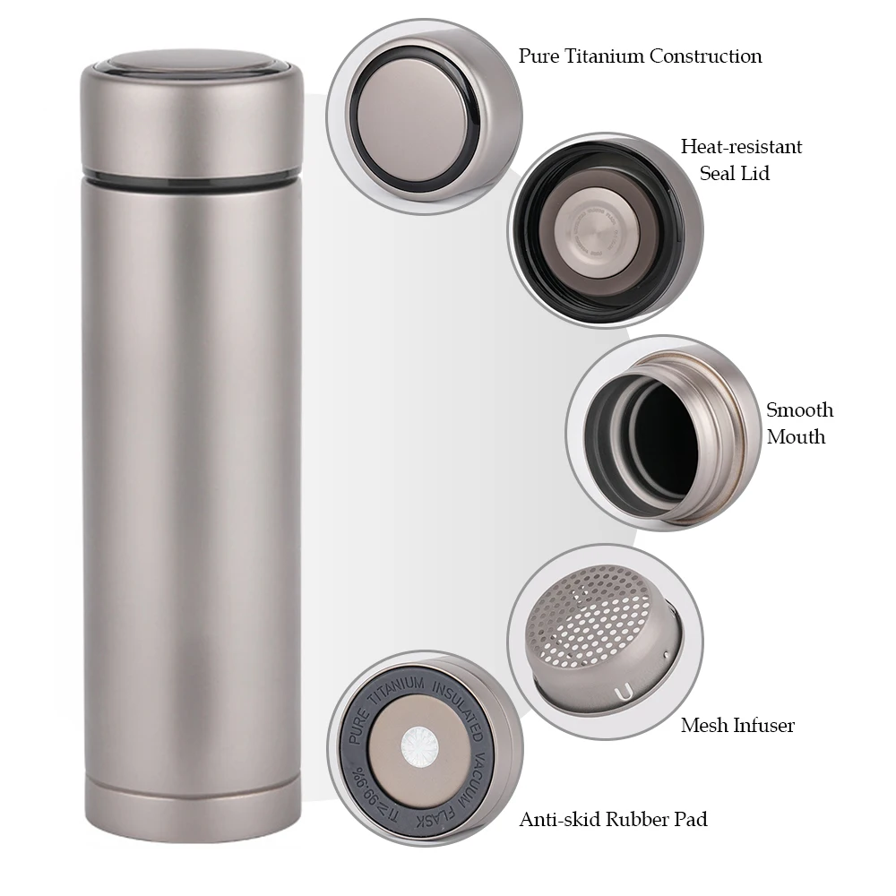 Титановая бутылка для воды с двойной изоляцией делает воду холодной или горячей в течение нескольких часов. Идеально подходит для занятий спортом, дома, офиса и активного отдыха.