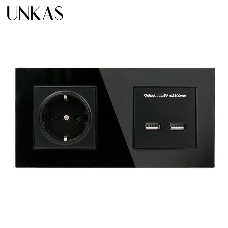 UNKAS настенная Хрустальная стеклянная панель, 2 банды, розетка с заземлением 16А, Европейская электрическая розетка с двойным USB портом для смарт-зарядки, 5 В, 2 А
