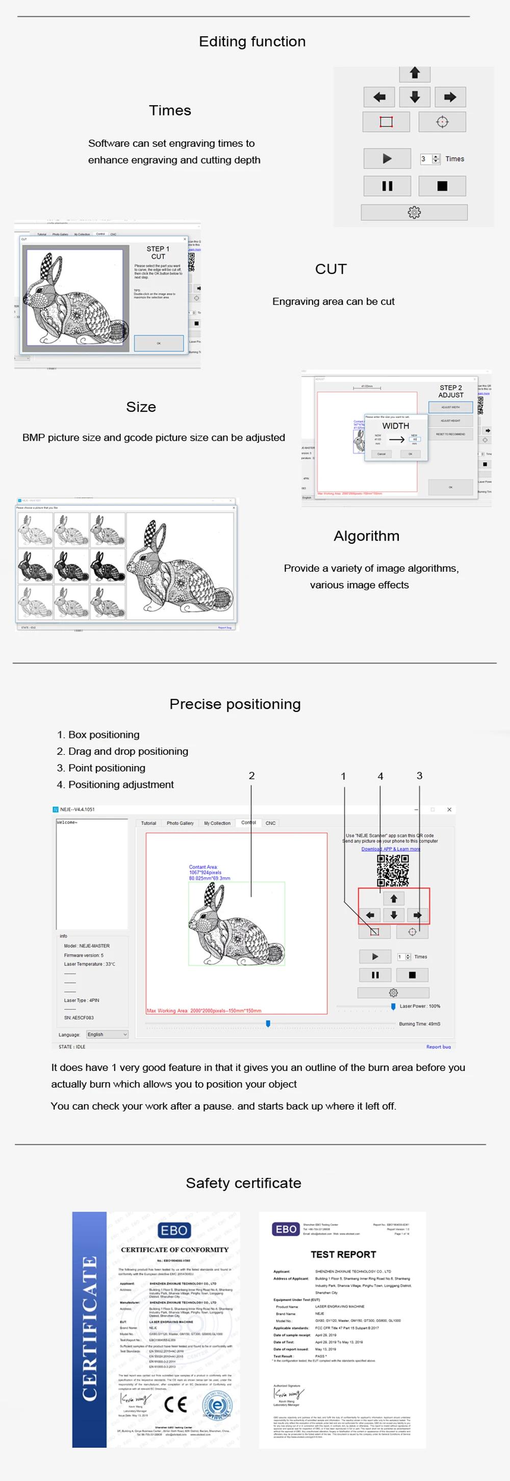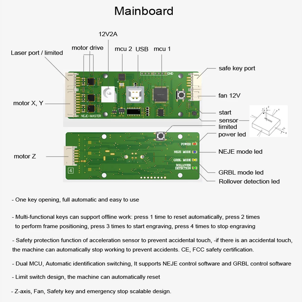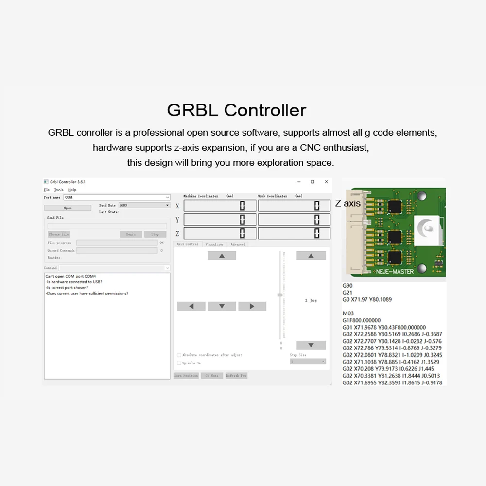 Особенности: Это не набор «сделай сам». После строгой проверки качества вся машина была протестирована и собрана на заводе, вам просто нужно собрать ось X и ось Y вместе, очень легко начать. Поддержка приложения «neje scanner», интеллектуальная коллекция и создание, сканирование фотографий, интеллектуальный алгоритм автоматической печати подключений. В. JPG или. Фото PNG с камеры или альбома и отправьте фотографию непосредственно на программное обеспечение windows и MAC. Встроенная машина с защитным устройством гироскопа. Когда машина работает, встроенный гироскоп будет записывать рабочее положение в начале. Если есть случайное касание или машина смещена, машина автоматически прекратит работу, чтобы предотвратить несчастные случаи. Профессиональный алгоритм обработки файлов, программное обеспечение может восстановить ваш дизайн 1:1 без потерь на каждый пиксель. Различные алгоритмы изображения лучше представляют характеристики изображения вашей семьи или кумира. Установить драйвер и программное обеспечение было очень просто. Загрузите и установите непосредственно по ссылке, программное обеспечение будет автоматически подключено после открытия программного обеспечения. Предоставить профессионалам возможность непосредственно разбирать работы, разработанные по Inkscape и CAD, непосредственно выполнять. Nc файлов и др. Dxf файлы и выполнять их точно. Вы можете сделать сложные изменения в PS / Inkscape / CAD или аналогичные и просто сжечь с включенной программой. В то же время, он поддерживает программное обеспечение NEJE control и программное обеспечение GRBL, которое может не только наслаждаться простой портативностью программного обеспечения NEJE,Но также поддерживает работу программного обеспечения GRBL с открытым исходным кодом; Он поддерживает динамический лазерный модуль управления, разработанный Neje, который может поддерживать регулирование мощности PWM, регулирование низкой яркости света, лазерную защиту от индукции температуры. Полнофункциональные, которые непосредственно выполняются. BMP. JPG. Файлы PNG и «NEJE CLOUD» обеспечивают тысячи гравировальных материалов и ресурсов для загрузки и обновления. Стандартная лазерная трубка 450nm 7000mW. Мастер 7W специализируется на гравировке металла и глубокой гравировке и резке древесины. Совместим с различными силовыми лазерами, поддерживая 4pin 405nm 3500mw, 4pin 450nm 7000mw и 4pin 450nm 20W. Лазерный фокус легко регулируется руками, а Фокусирующая головка фиксируется резиновой прокладкой. Концевая конструкция переключателя, машина может автоматически сбросить. Двойной MCU: один MCU для поддержки NEJE контроллера (Windows и MAC), другой для GRBL контроллера. Вы можете проверить свою работу после паузы и начать назад там, где она остановилась.