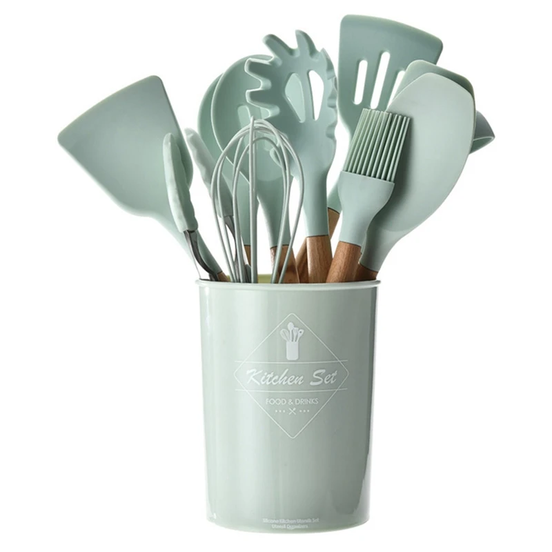 12 шт. набор кухонной утвари, силиконовая посуда для приготовления пищи, лопатка для приготовления пищи, термостойкие инструменты с деревянной ручкой для антипригарного покрытия