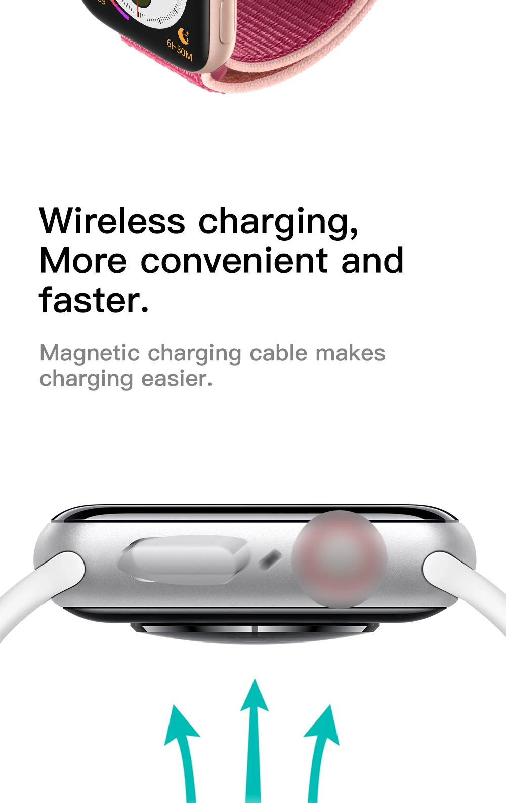 Чипсет: MTK2502; Размер: 44x38x10,7 мм; Вес: 50 г; Материал корпуса: алюминий; Материал ремешка: Стандартный ремешок Apple, сменный; Зарядное устройство: беспроводное зарядное устройство; Беспроводное зарядное устройство не является стандартом Qi, оно предназначено для беспроводной зарядки часов.
