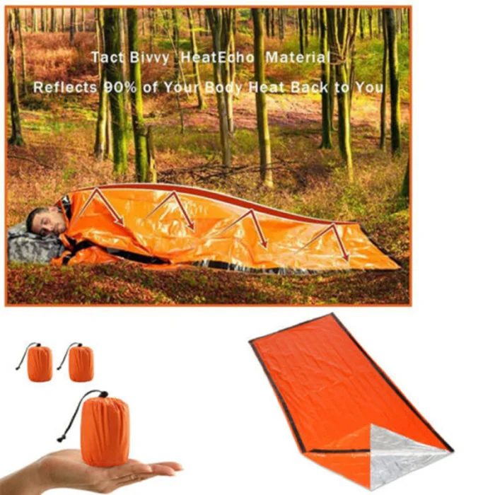 1. When camping, it can be used to strengthen the wind protection effect outside the sleeping bag. 2. An emergency sleeping bag can keep the weak patient from lossing heat. 3. When you arein danger in the wild.You can wrap the emergency sleeping bag around your body and use its reflective function to help the rescue people quickly find you. 4. It can be used to collect water,tents and waterproof mats. 5. Sun block