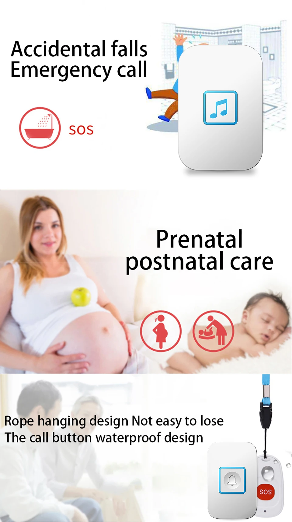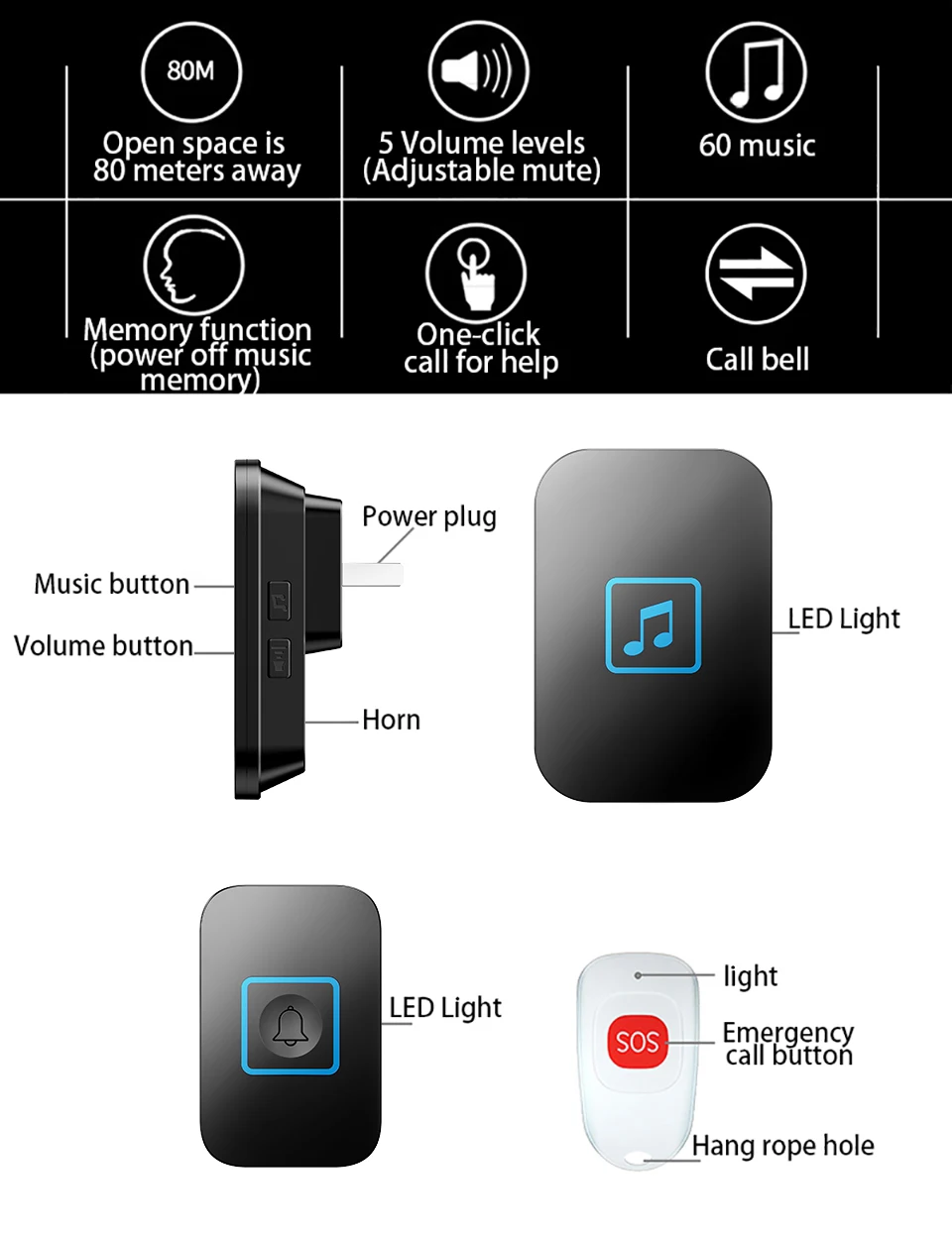 1.The button supports up to 20PCS, and the receiver supports up to 100pcs. 2.If multiple buttons are paired with one or more receivers in the same system, each button can be set to a different ringtone.(This feature supports the sos button.) 3. Power-off memory function: Turn the power on again after power off, no need to re-adjust and lock the ringtone.(This feature supports the sos button.) 4. The doorbell transmitter and sos button has no screw chuck design, and it can be waterproof and dustproof without rubber ring. 5.The transmitter USE a 23A12V alkaline battery (not included battery). 6.The sos button USE a CR2032 battery.(not included battery). 7. Receiver voltage: 110-220V. 8.The receiver is available in a variety of plugs, US/EU/UK Plug and AU adapters, suitable for most countries. 9.Doorbell Receiving distance:300 meters in open area. 10.SOS button Receiving distance:80 meters in open area. 11.The wireless signal will be affected by obstacles. The more obstacles, the more serious the signal loss. 12.Receiver has 5 levels(can be mute) 0-110db,60 music to choose from. 13.Size:Transmitter:72x46x21mm, SOS button:60x34x11.5mm, Receiver:92x62x32mm. NOTE:The button cannot be placed on an iron door because it will interfere with the signal.