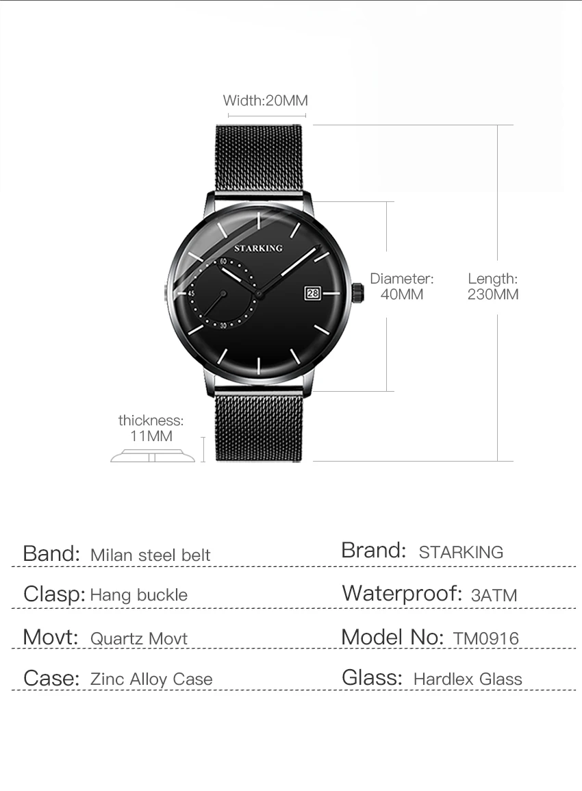Материалы -Номер модели: TM0916 -Чехол из цинкового сплава -Сетчатый ремешок из нержавеющей стали -Импортный японский movt -Функция автоматической даты -Hardlex Стекло -30 м водонепроницаемый Размер -Чехол Диаметр: 40 мм -Чехол Толщина корпуса: 11 мм -Ширина ремешка: 20 мм -Длина ремешка: 230 мм