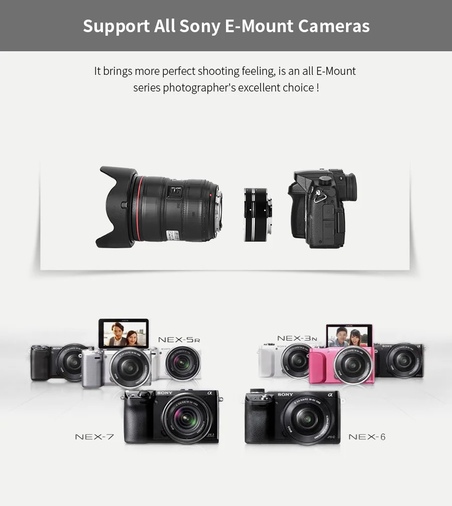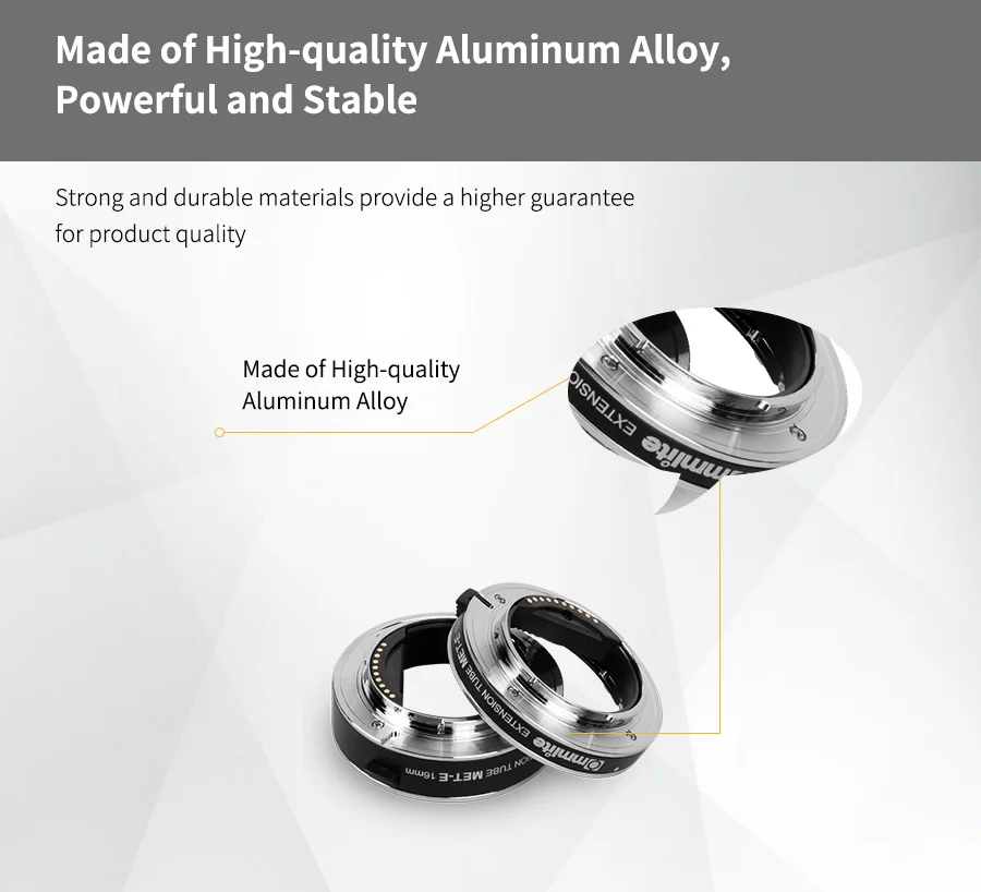 Автоматическая макроудлинительная трубка для Камеры E-Mount состоит из двух различных колец (10 мм, 16 мм), которые можно использовать отдельно или комбинировать (3 разных комбинации) для удовлетворения ваших потребностей в различных увеличениях крупным планом. Коннектор разработан с использованием новой электронной технологии, которая поможет вам достичь автофокуса и функций экспозиции TTL, а также поддерживает полнокадровую съемку. Это прекрасный партнер для Sony E-Mount lens и камеры, используемые для макросъемки!