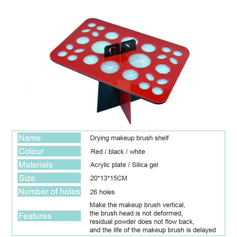 Характеристики: 26 отверстий: 2 для X больших, 3 для больших, 5 для средних и 16 для маленьких. Крестообразная оправа, стабильно поддерживающая. Повесьте кисти вверх дном, высушите их быстрее. Защитите форму кистей для макияжа после стирки, увеличьте срок их службы. Подходит практически для всех кистей для макияжа. Характеристики: Тип: держатель для кисти Материал: Акрил Цвет: 3 размер изделия: 15*20*13 см Примечание: кисти в комплект не входят. Посылка: 1 * Сушилка для кистей