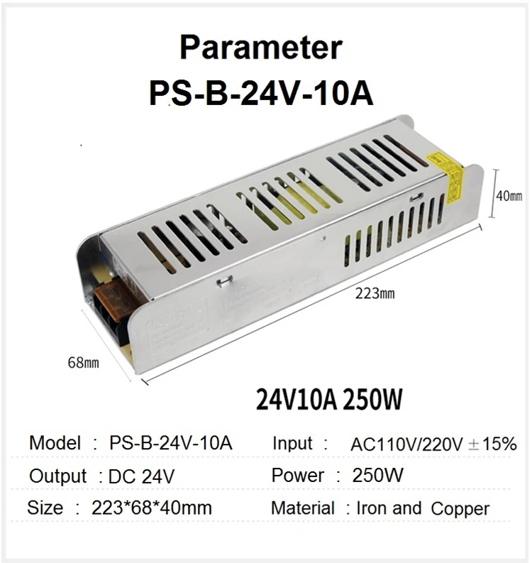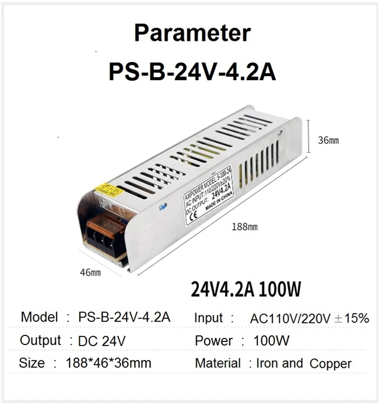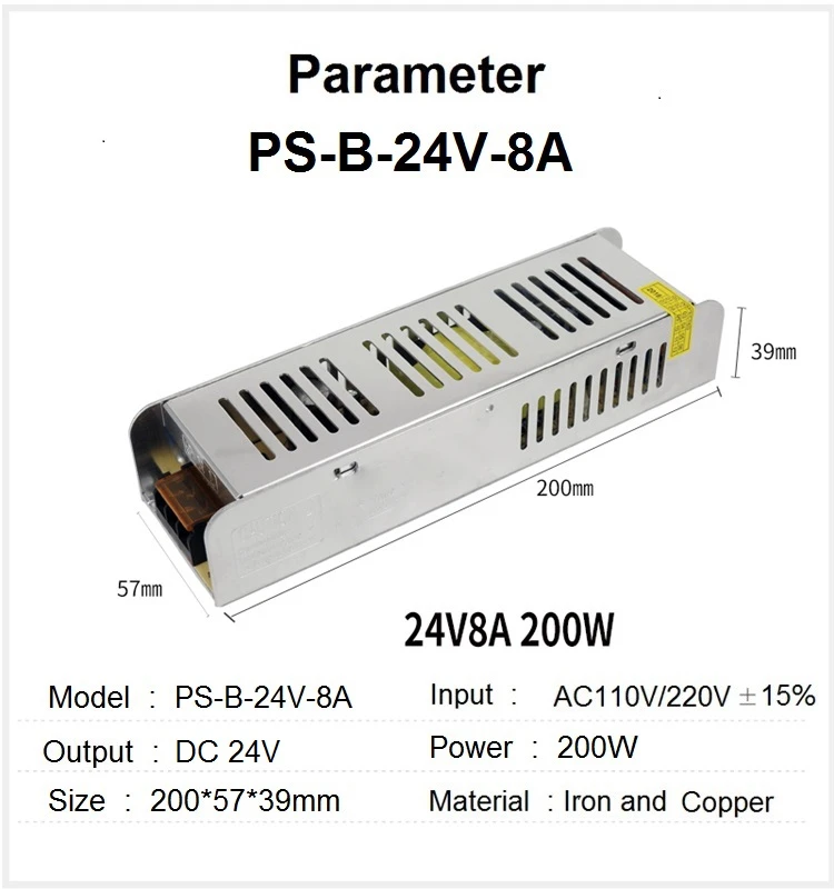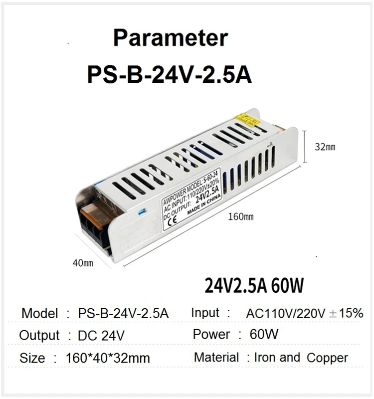 Светодиодный импульсный источник питания Вход 110V/220Vac Выход 24VDC Curren 2.5A/4.2A/6.2A/8.2A/10A/12.5A/15A Мощность 60/100/150/200/250/300/360W Шнур питания не входит в комплект по умолчанию Если вам нужен шнур питания, необходимо купить его у опции EU/AU/US/UK Шнур питания 1,5 метров в длину, 3*0.75m2 кабель