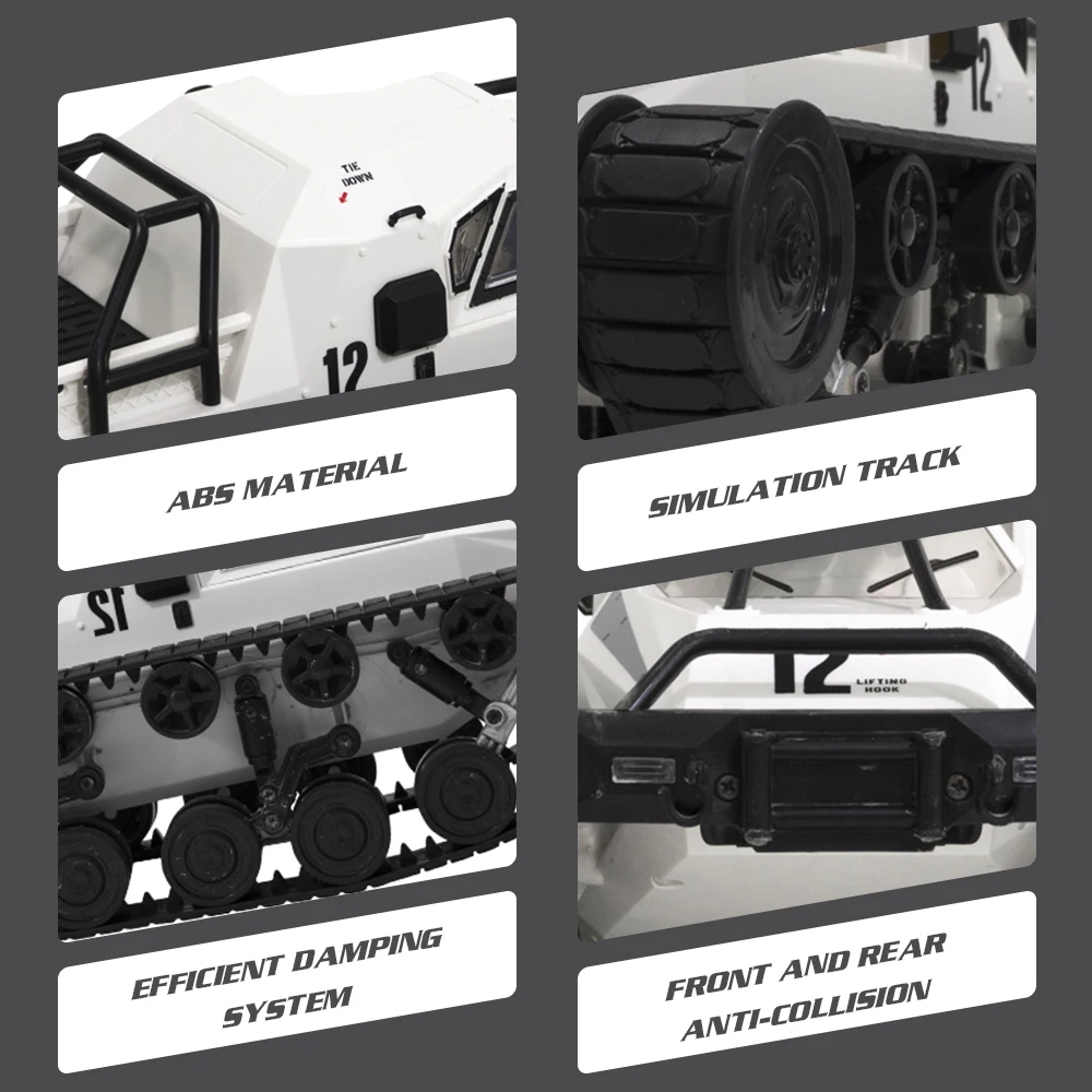 Полноразмерный дизайн, пропорциональный контроль. Коробка передач с двойным приводом; Поворот на 360 ° на месте; Расстояние между поперечными канавками до 10 см; Наклон скалолазания 30 °; Глубина погружения может достигать 5 см; открывающаяся дверь с крыльями чайки; Саморегулируемое натяжение переднего колеса.