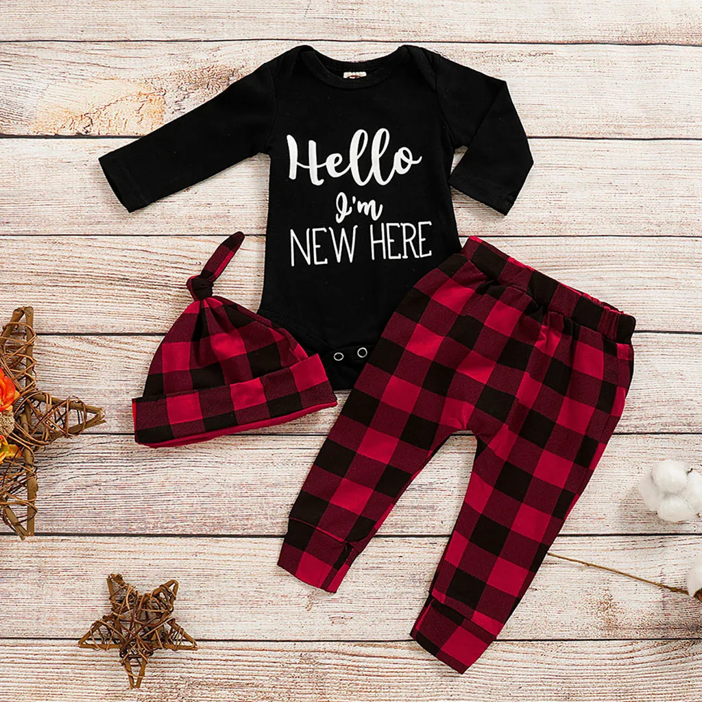 Детский комбинезон с буквенным принтом для маленьких мальчиков и девочек, боди + штаны в клетку + шапочка, комплекты одежды