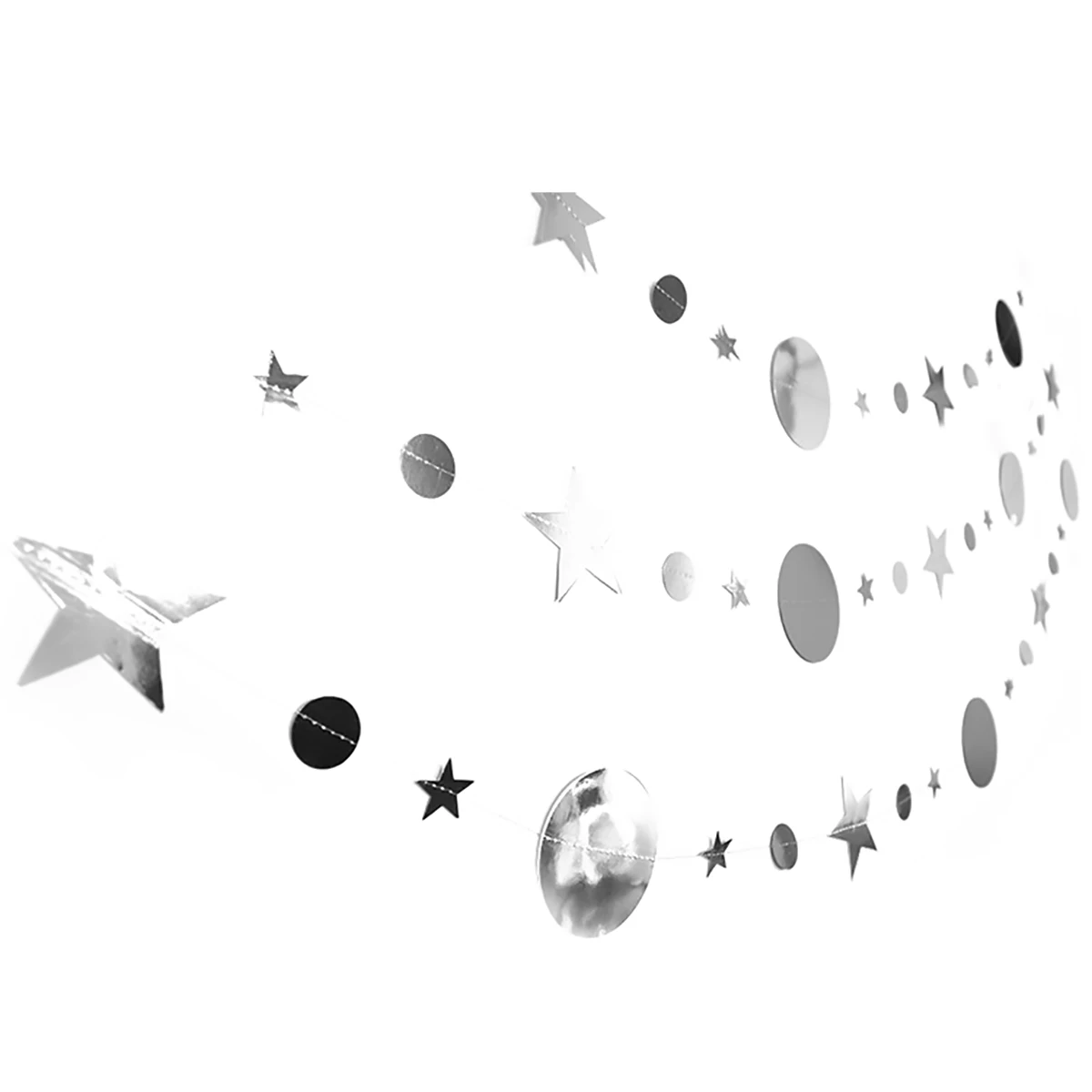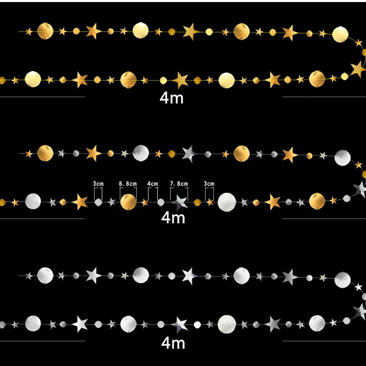 Материал: Бумага Длина: 400 см Размеры: звезда: 3 см/7,8 см Круглой формы: 3 см/8,8 см Цвета: Золотой/Серебряный