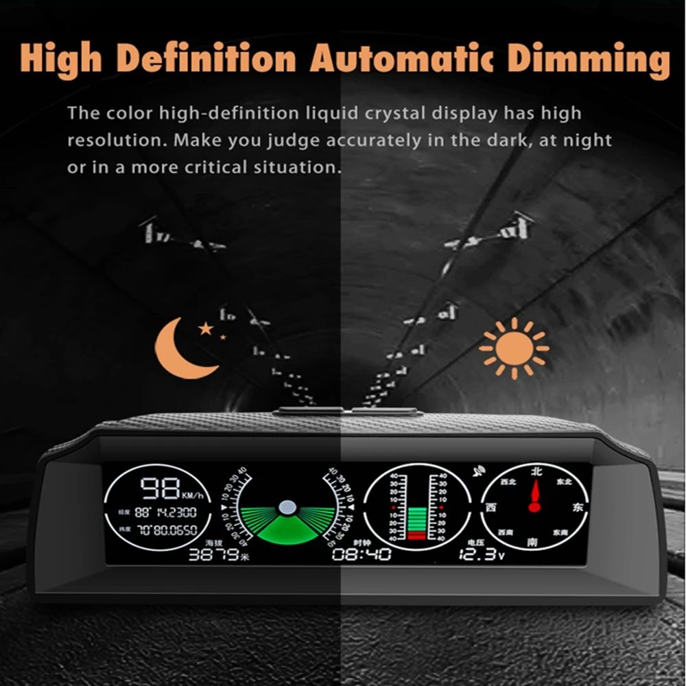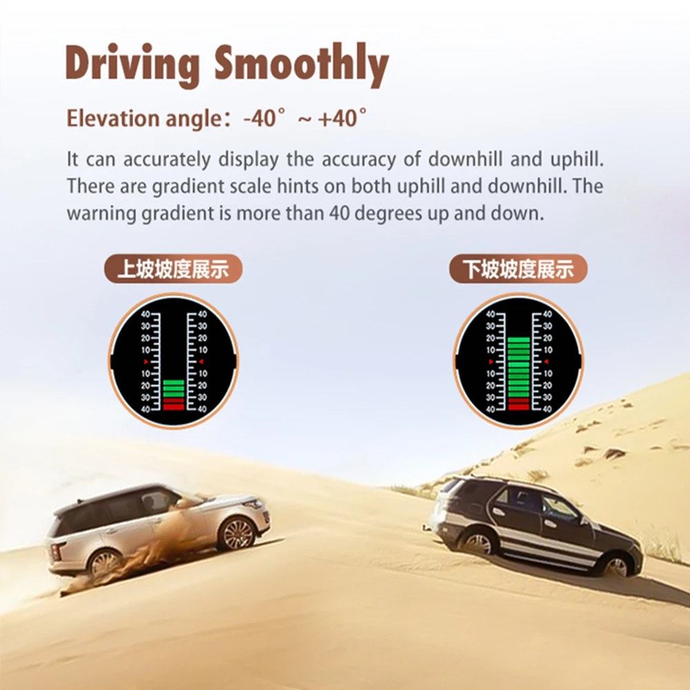 Точно показывает угол наклона автомобиля с четким уведомлением, когда угол более 40 °, оповещает о тревоге.